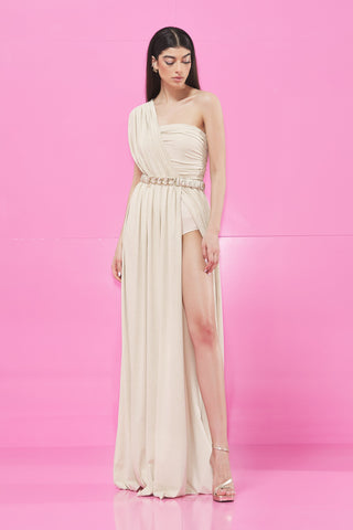 Abito PALLASITE lungo cut-out monospalla più arricci con spacco lat. più rouches