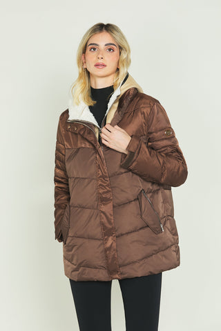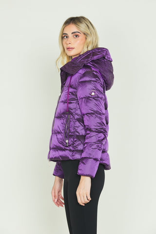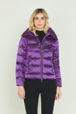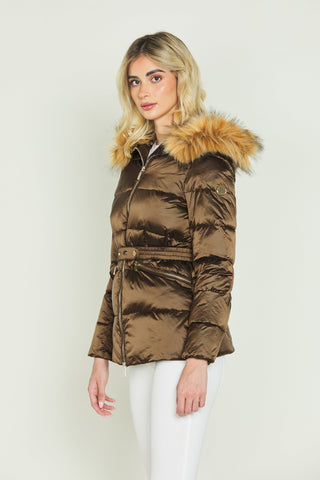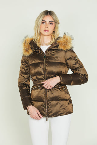 Piumino FUYUE in raso manica lunga con cappuccio più bordo ecopellicia più cintura