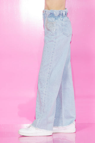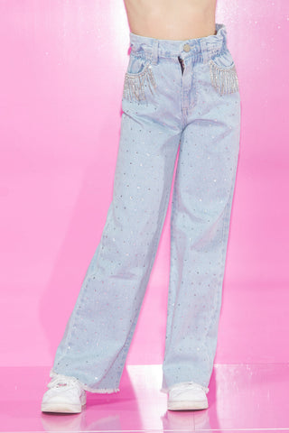 Panta SLOW Denim Sfrangiato con Strass più Passamaneria Catene Tasche