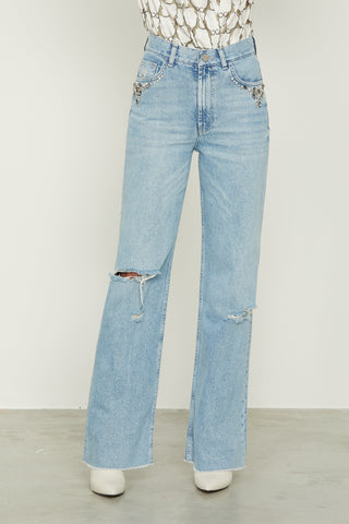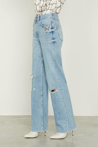 Jeans CIOCCOLATA vita alta 5 ts con rotture più appl. Pietre più perle denim