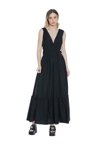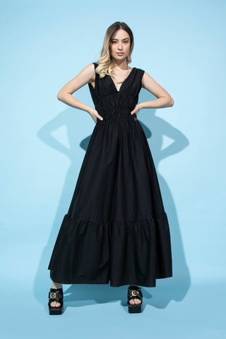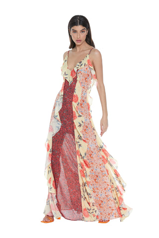 Abito PEACOCK lungo con spalline più rouches stampa fiori multicolor