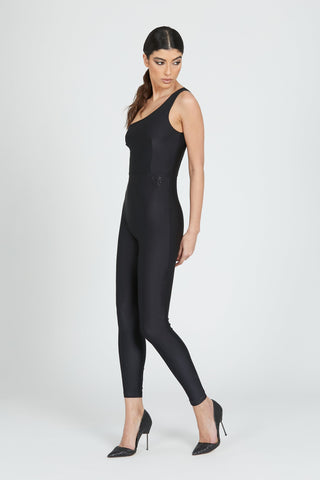 Jumpsuit MONOSPA cavallo basso monospalla ciniglia più logo relish strass