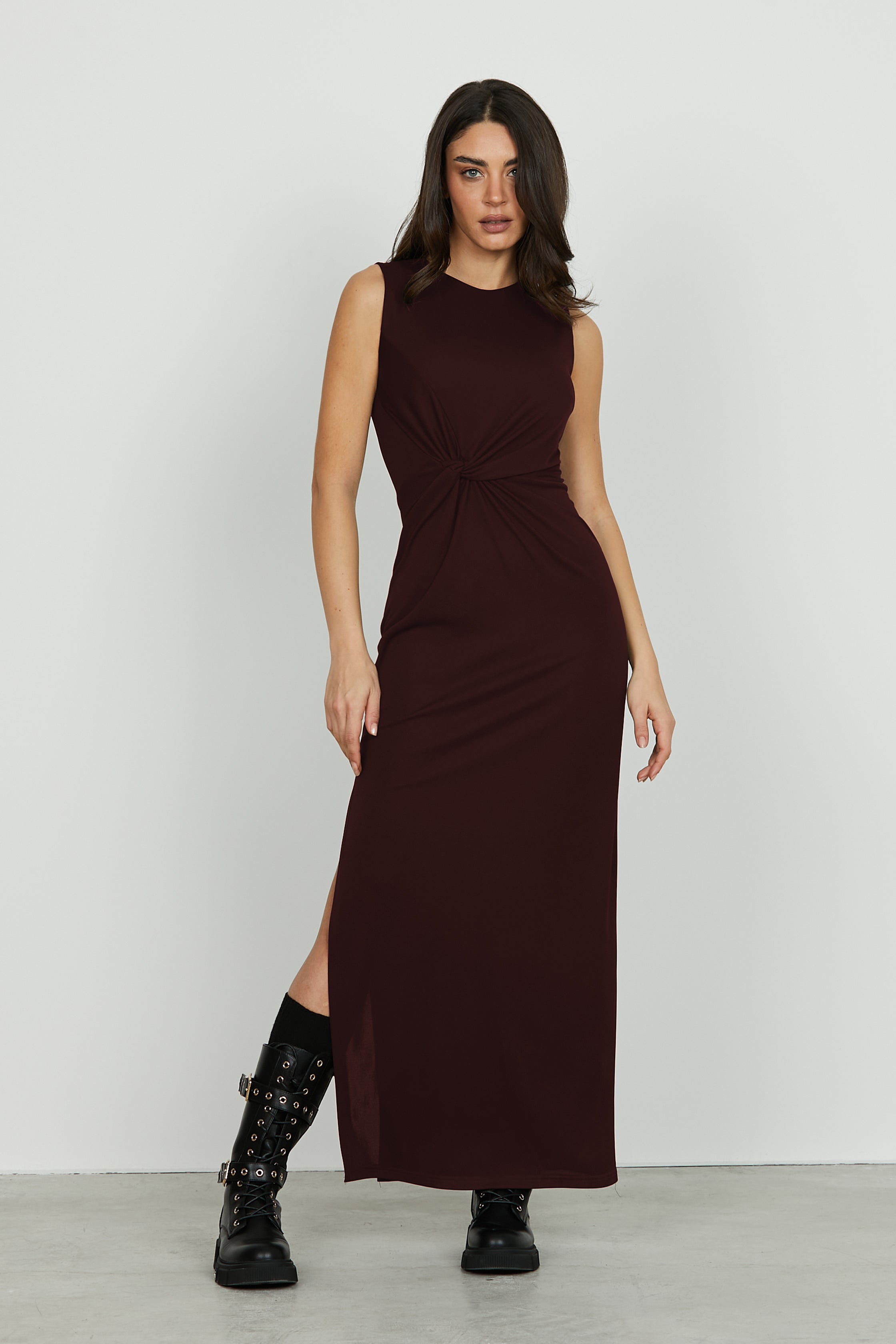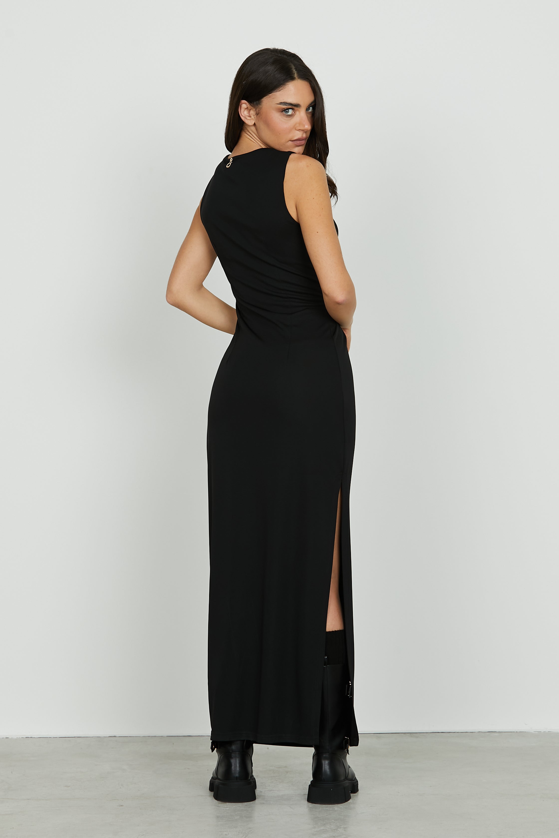 Linee pulite e dettagli sofisticati per un abito che non passa inosservato. Il modello CECIDI, lungo e senza maniche, avvolge la figura con eleganza grazie al nodo in vita che sottolinea delicatamente le forme. Lo spacco sul fondo aggiunge movimento e sensualità, rendendolo perfetto per cerimonie, serate speciali o eventi formali. Un capo essenziale ma d’impatto, pensato per chi ama distinguersi con classe.