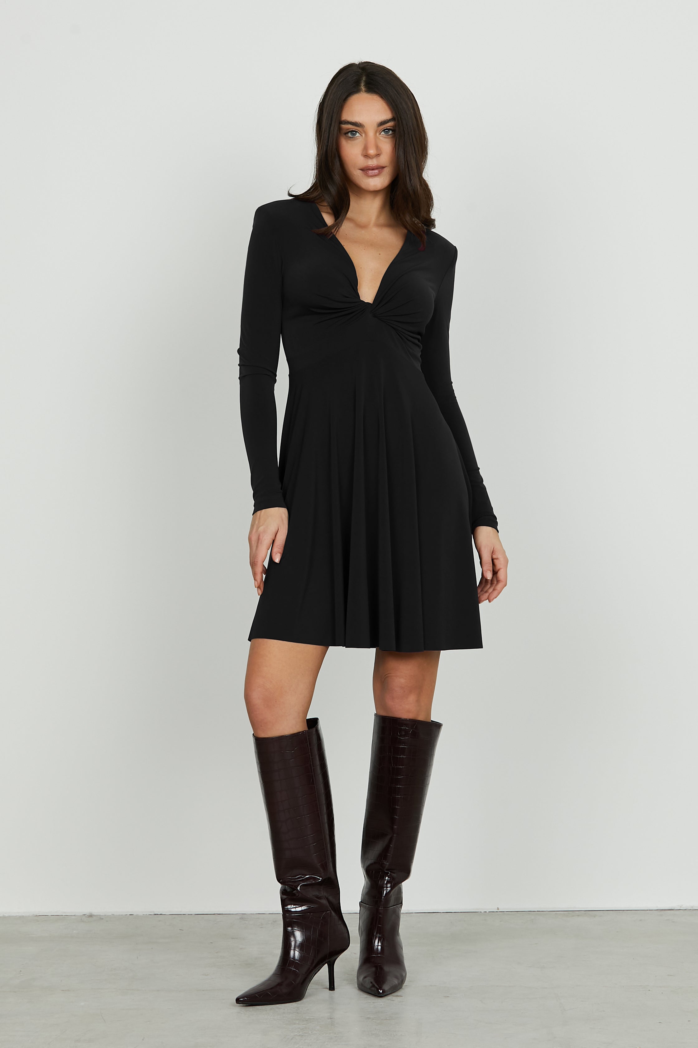 L’abito QUIRIMBAS è pensato per chi ama uno stile raffinato ma senza eccessi. Il taglio corto e lo scollo a V valorizzano la silhouette con delicatezza, mentre il nodo decorativo sullo scollo aggiunge un tocco di originalità e femminilità. Versatile e chic, è perfetto per occasioni casual ma anche per momenti più speciali.