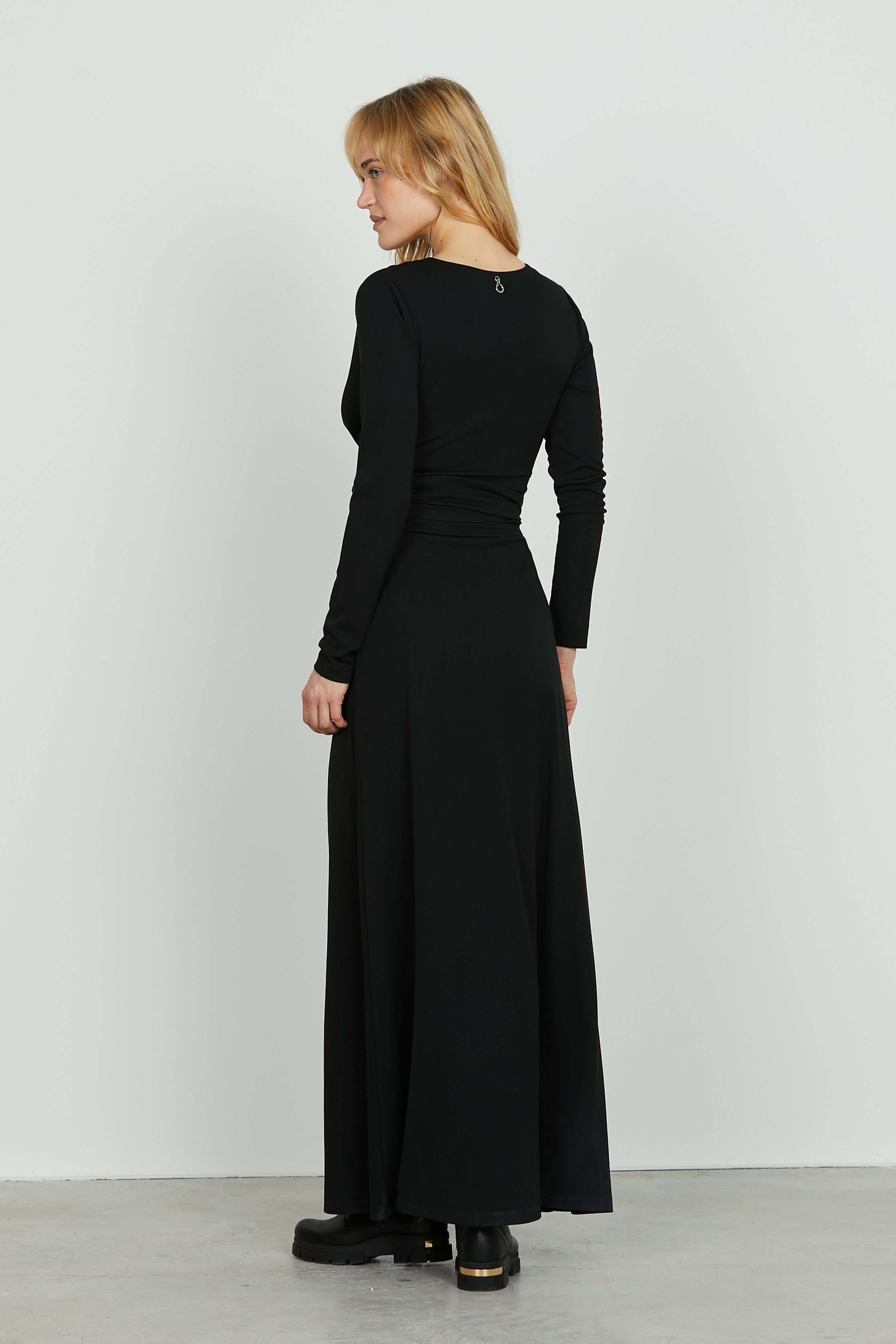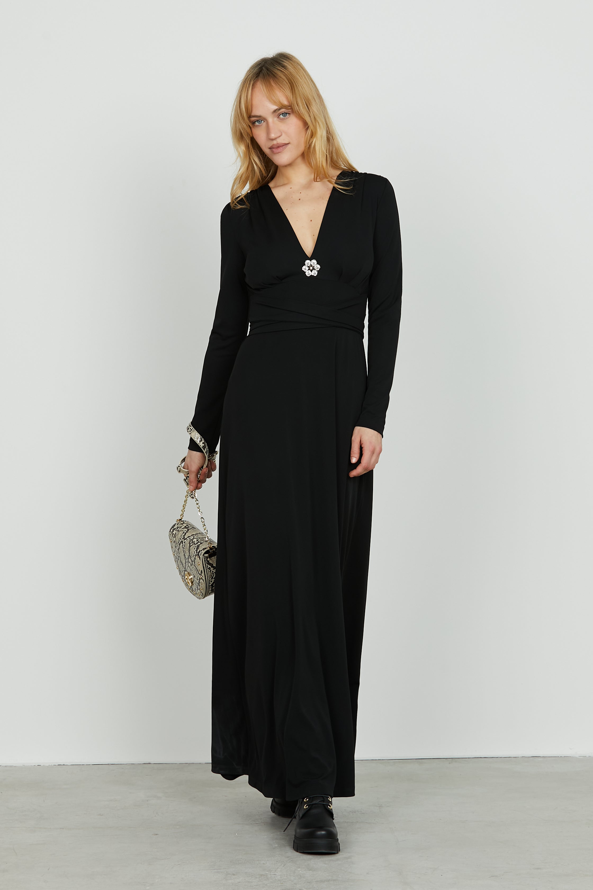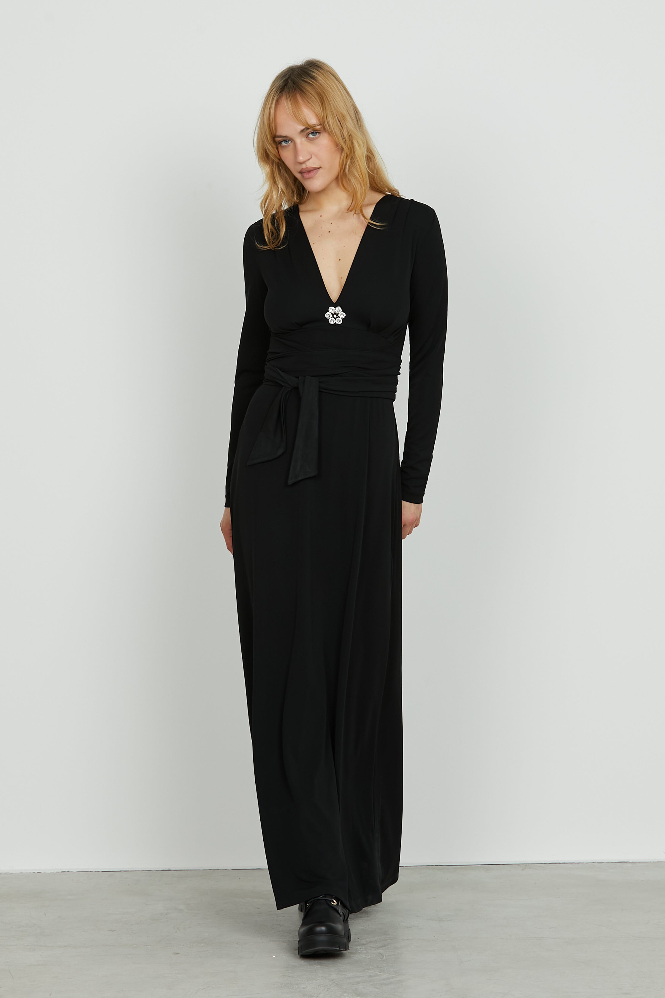 Lasciati conquistare dal fascino senza tempo dell'abito REFERS lungo con maniche lunghe e profondo scollo a V, impreziosito da un’applicazione gioiello che cattura lo sguardo. La cintura in vita definisce la silhouette con grazia, creando un look sofisticato perfetto per le occasioni speciali. Un abito che non passa inosservato.