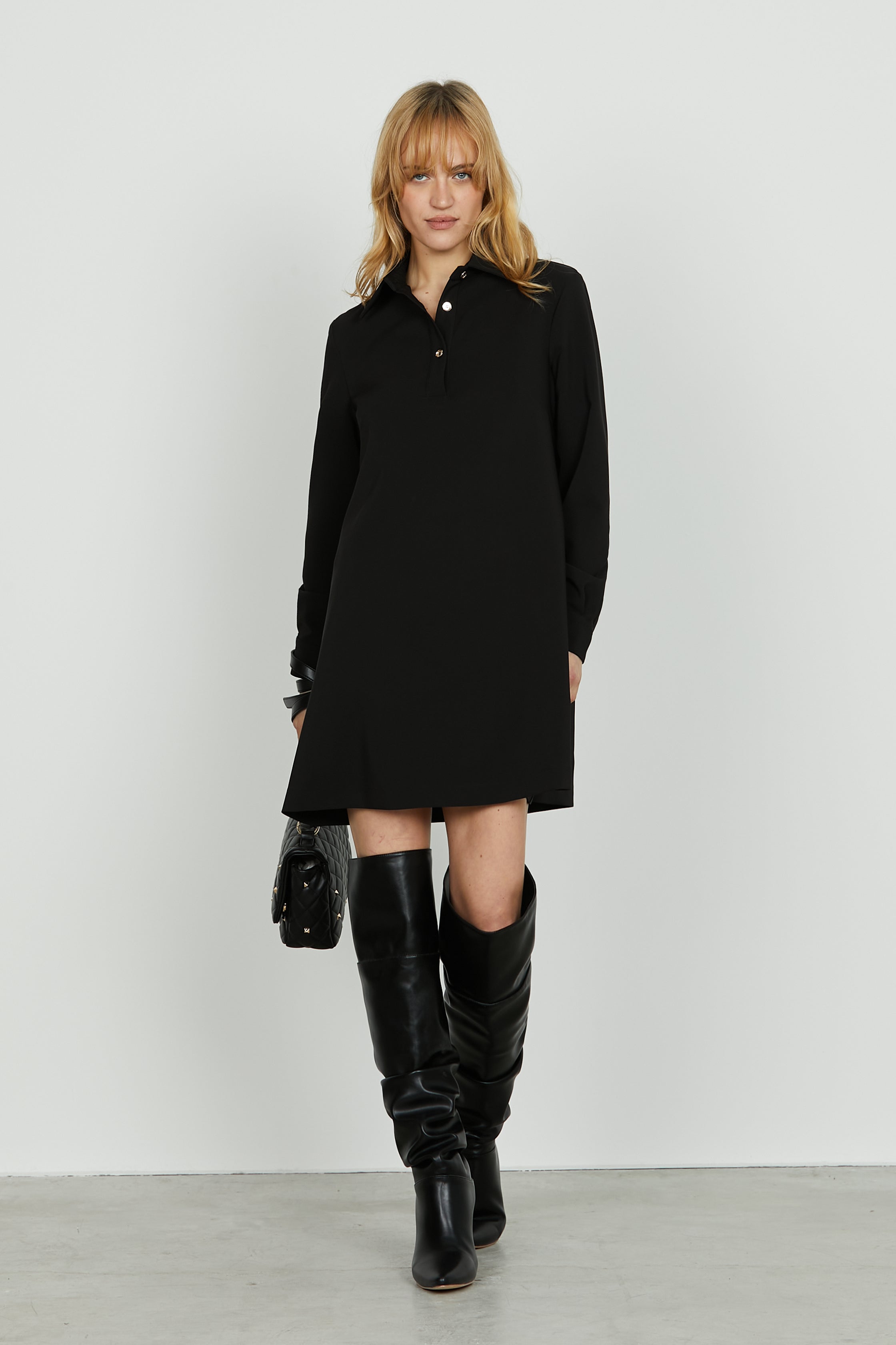 L’Abito SOFFIO Corto con manica lunga e scollo camicia è perfetto per chi cerca un look pulito e versatile. Linee essenziali e dettagli minimal lo rendono ideale sia per il giorno che per la sera, con un tocco di classe senza tempo.