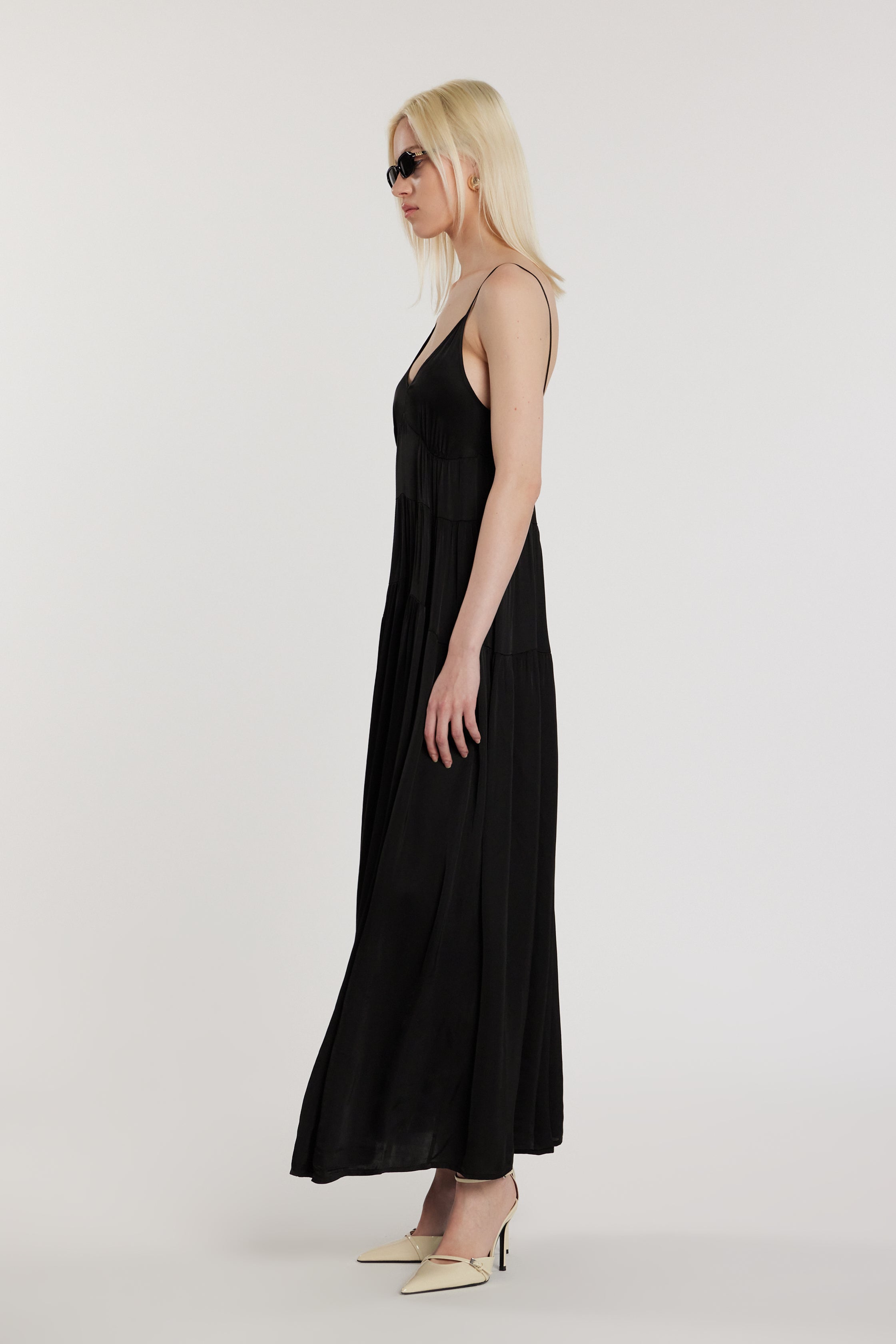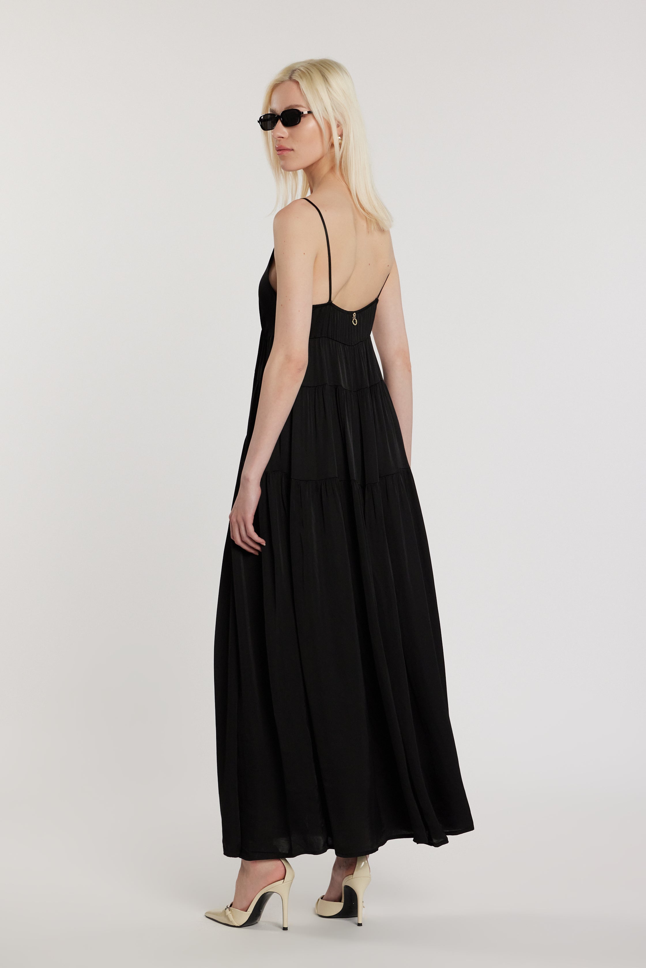 Abito MANNYS lungo smanicato con arricci più balze in raso