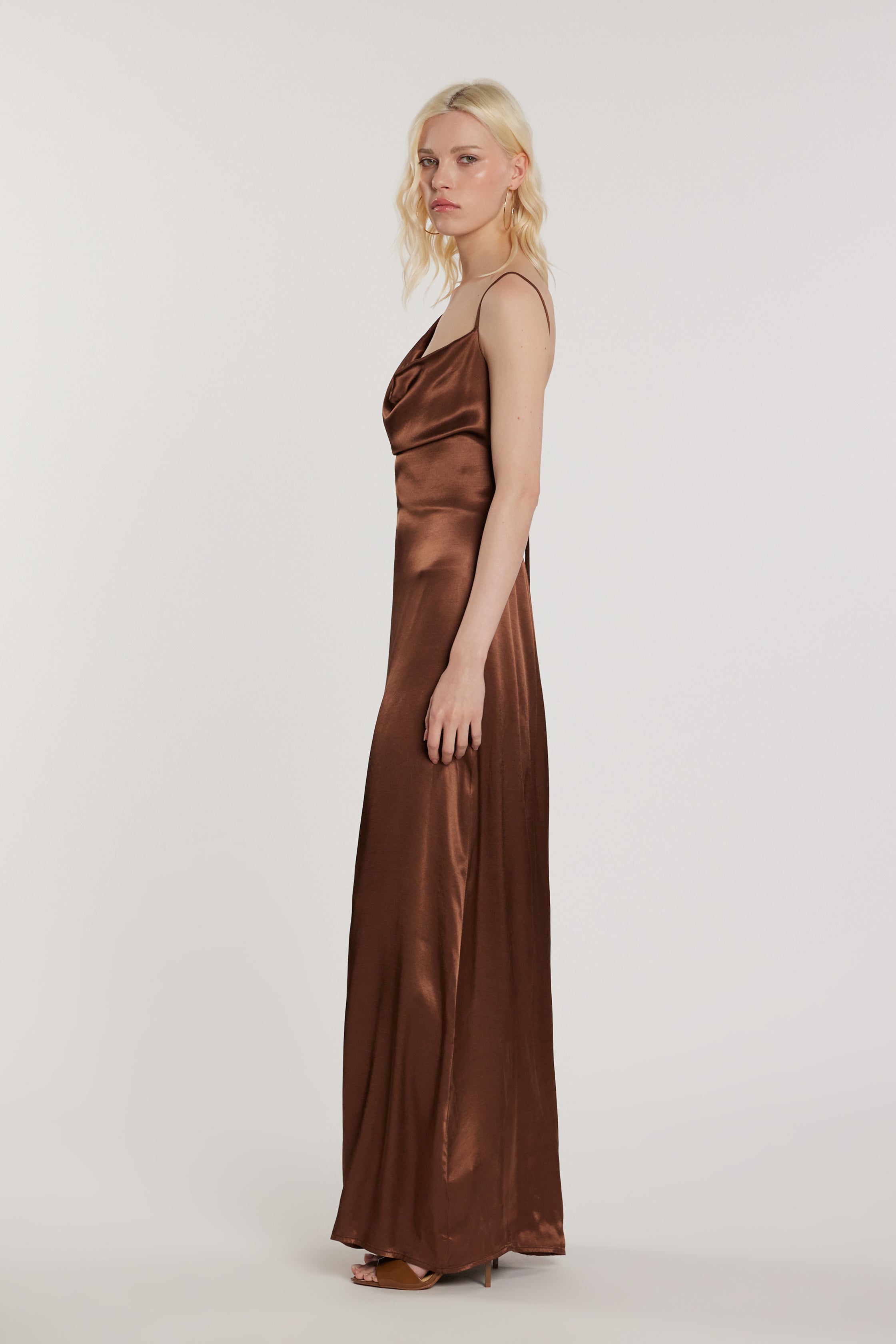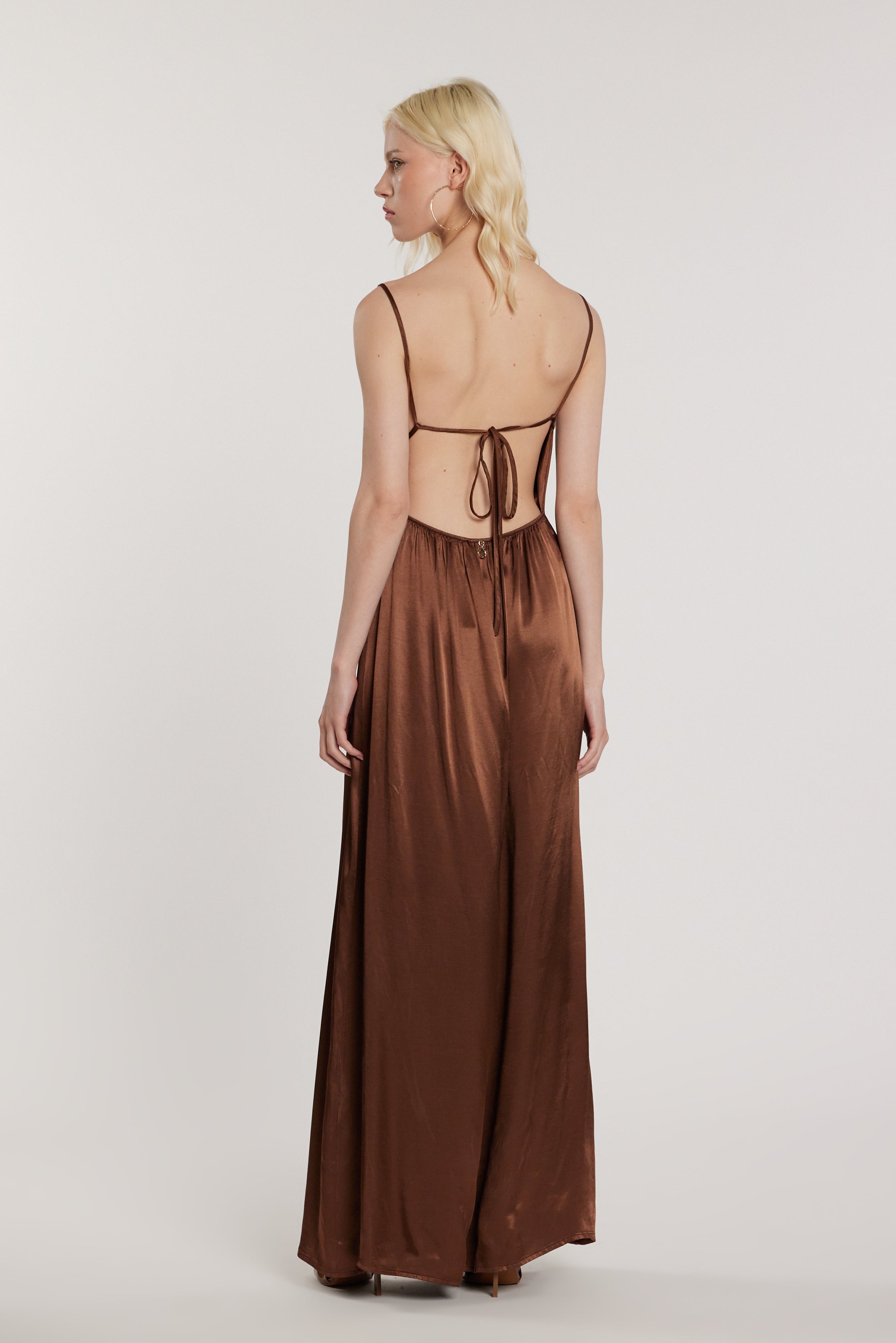 Abito Morell lungo senza maniche con scollo alla americana, apertura sulla schiena, fusciacca e balza, un capo scenografico e femminile. La fusciacca e la balza creano dinamismo e eleganza, mentre lo scollo aperto sulla schiena aggiunge sensualità discreta, ideale per occasioni speciali.
