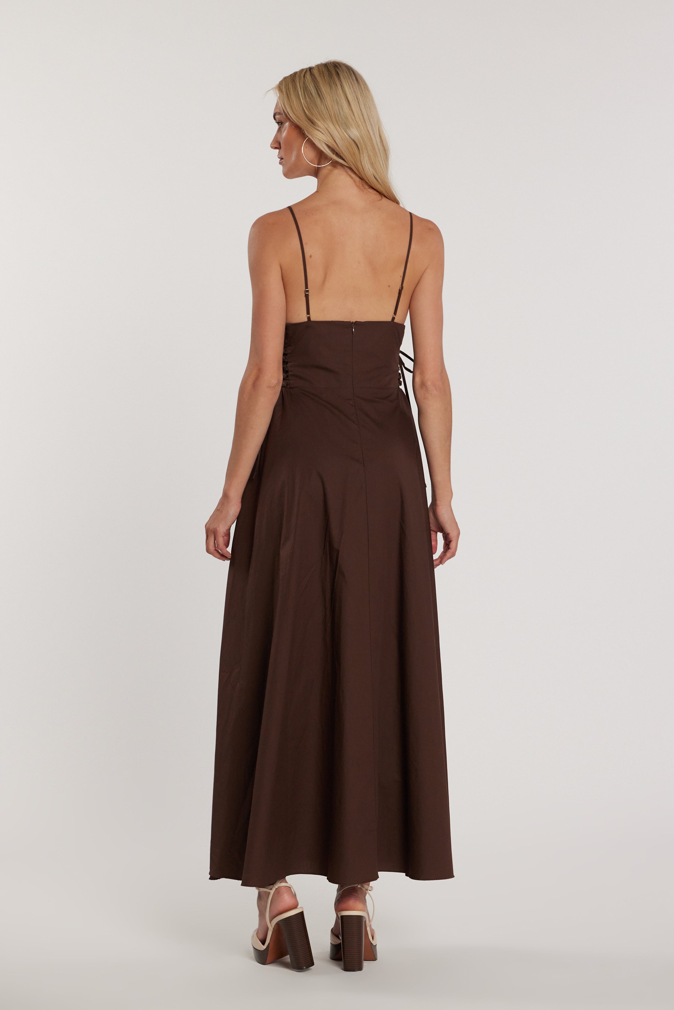 Abito Messy lungo senza maniche con punto smok e stringhe, un modello originale e sofisticato. Il punto smok valorizza la silhouette, mentre le stringhe aggiungono dettaglio fashion e femminilità, ideale per look serali chic.