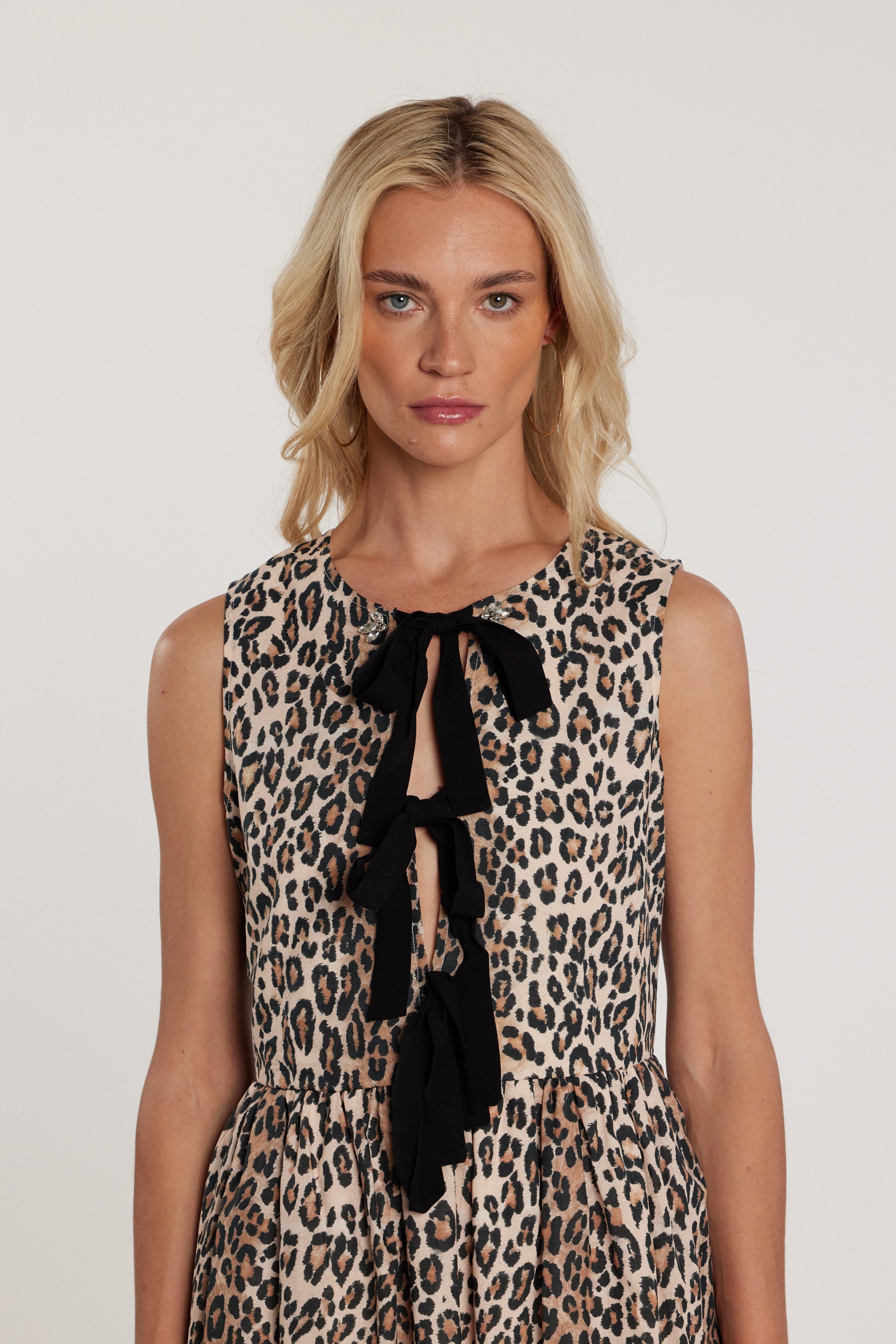 Abito Shields corto senza maniche con apertura sul seno, fiocchi e applicazioni di pietre fantasia animalier, un capo originale e femminile. Le applicazioni e i fiocchi creano luce e movimento, mentre la linea valorizza la figura con stile contemporaneo.