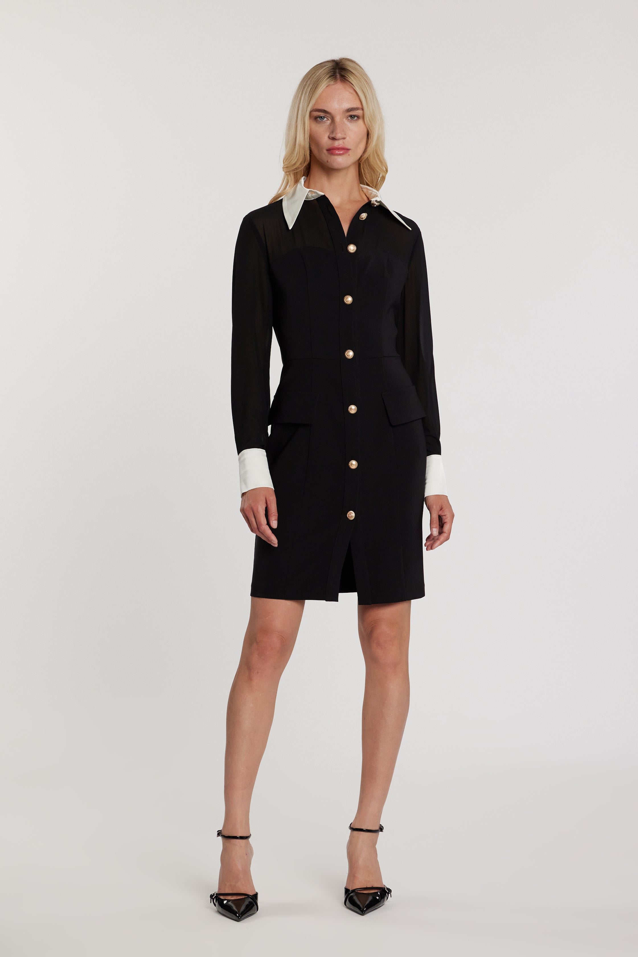 Abito VERSUX corto maniche lunghe con inserti tulle tubino scollo a cuore con bordi a contrasto più bottoni