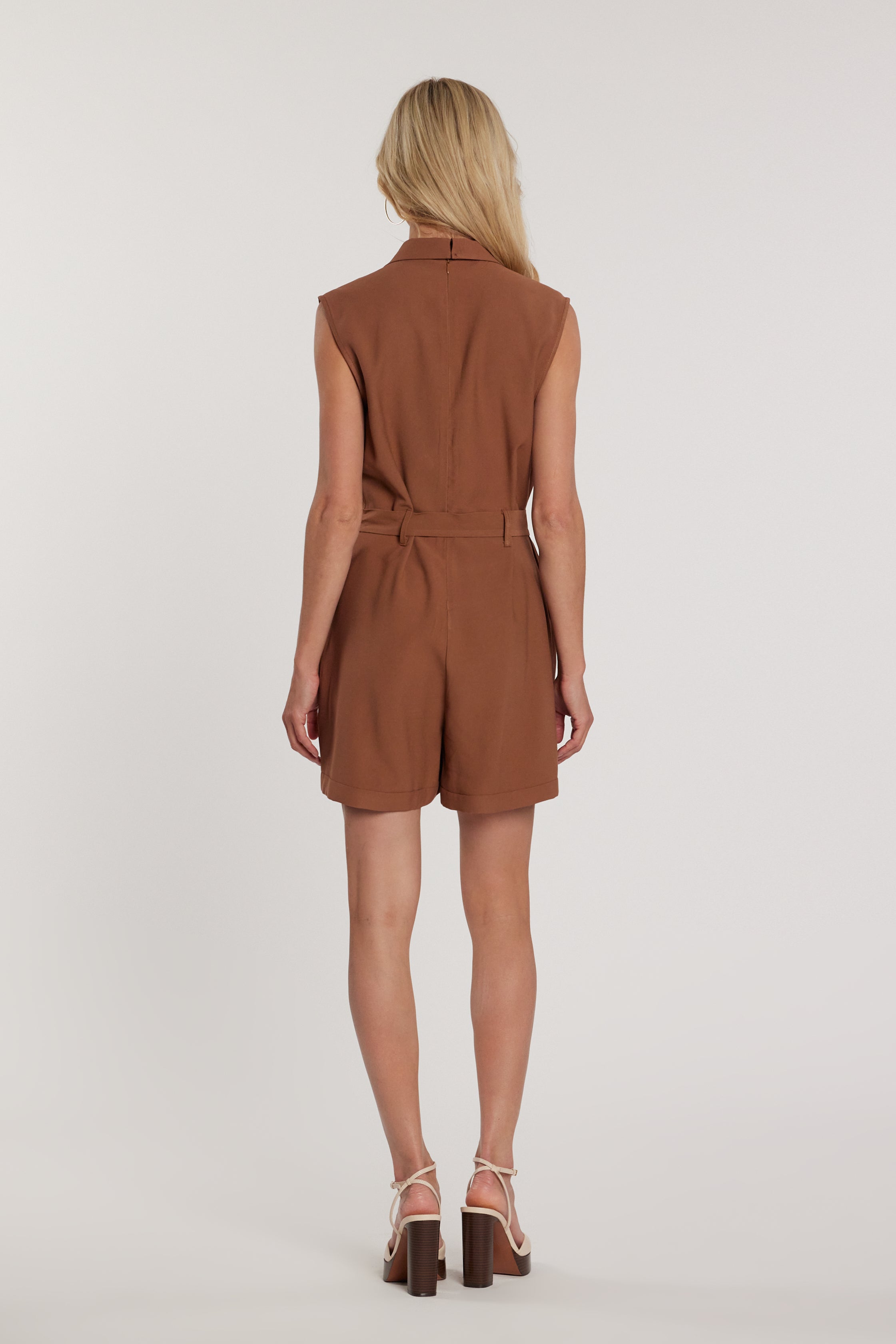 Tuta Argentero corta senza maniche effetto giacca a doppio petto con cintura e tasche, un capo sofisticato e moderno. La linea strutturata e il taglio corto valorizzano la silhouette, mentre la cintura definisce il punto vita con eleganza, perfetta per outfit urbani chic o serate eleganti.