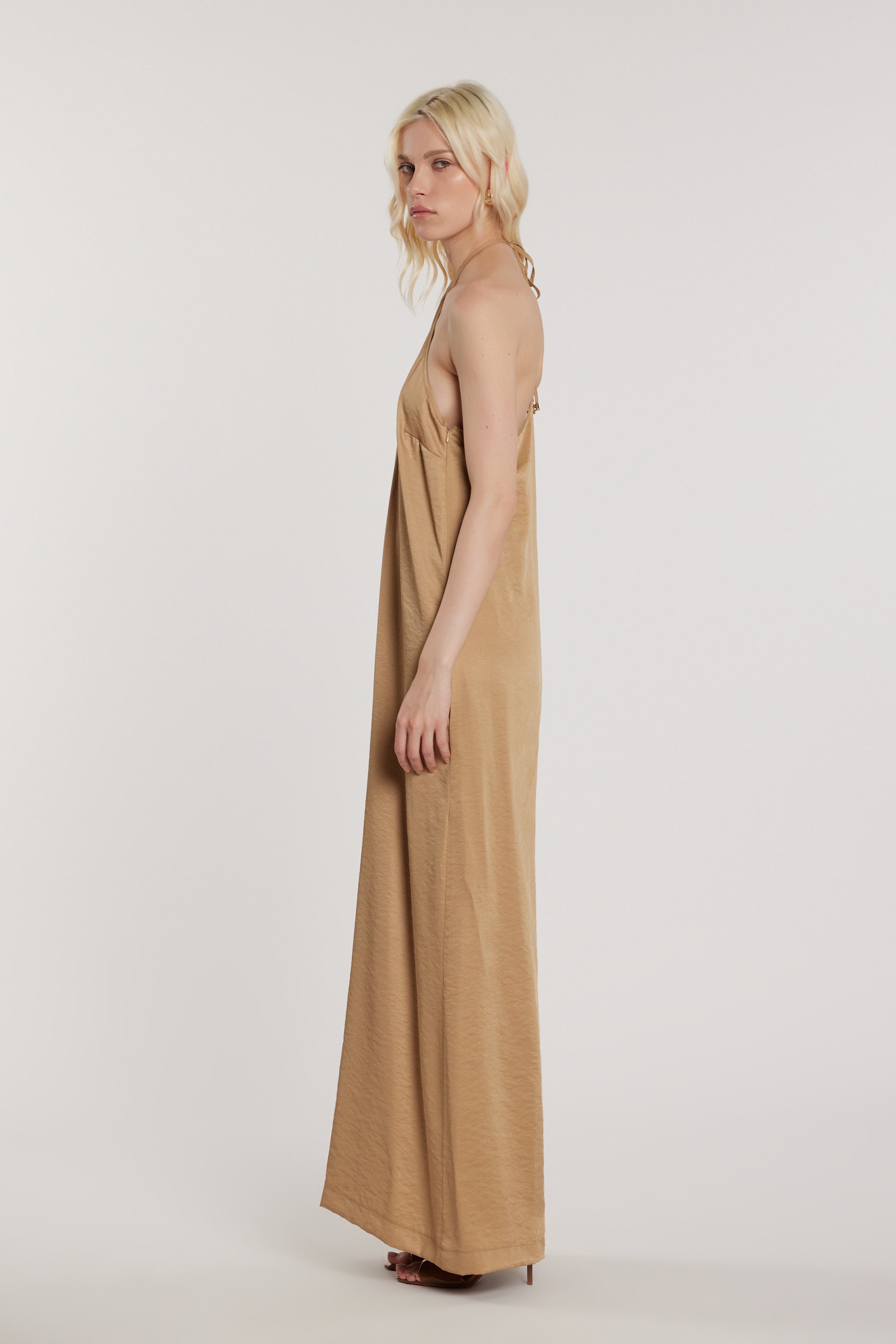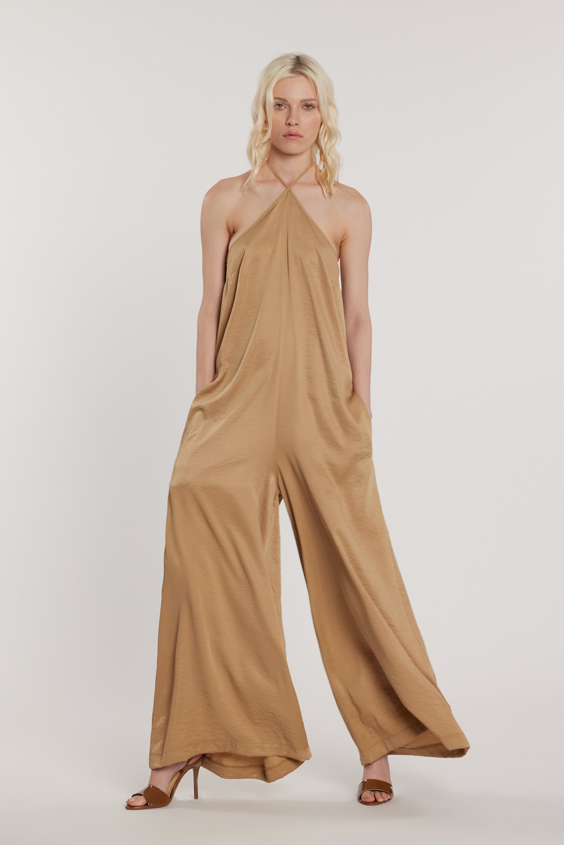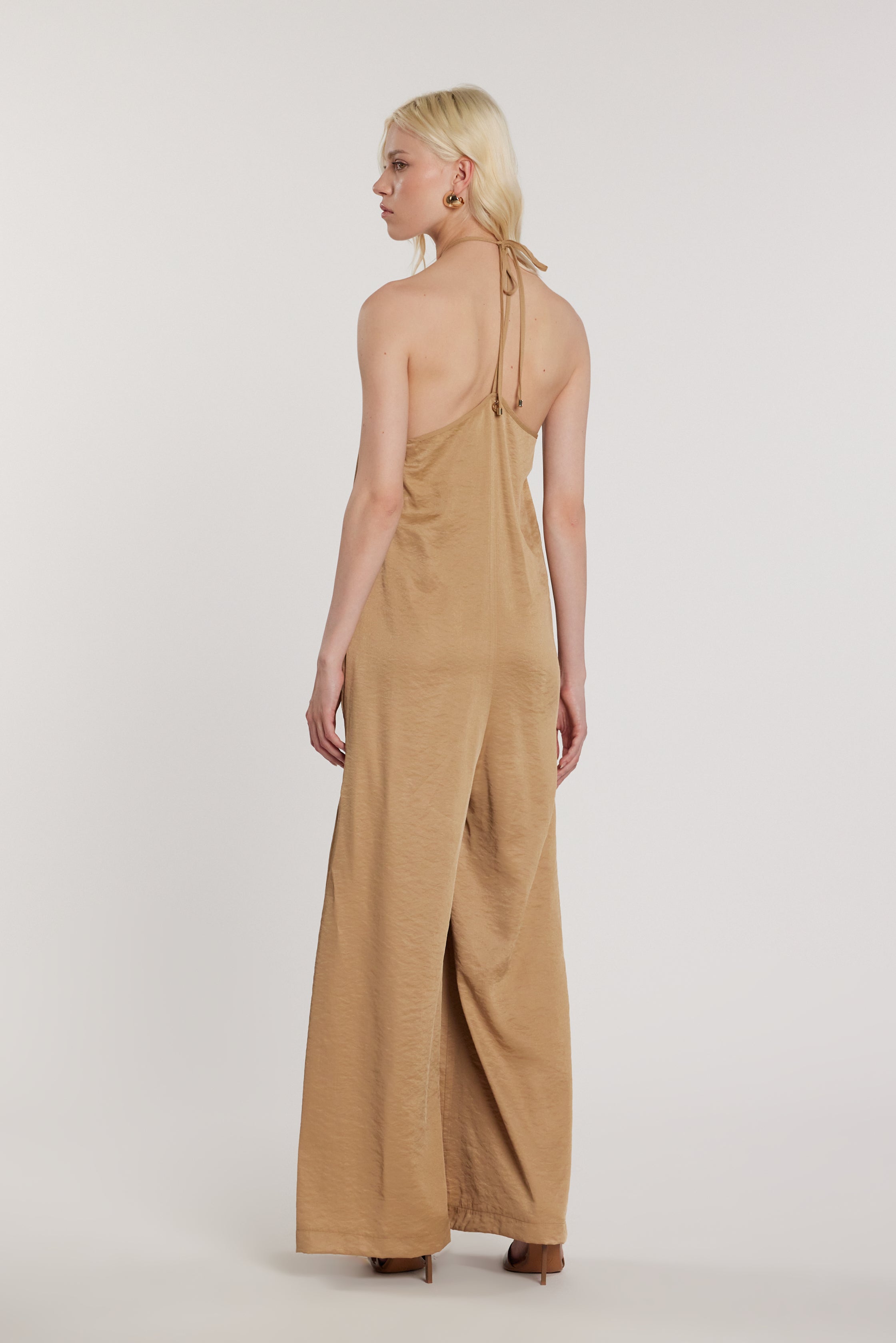 Tuta Morgian lunga senza maniche con scollo americana e laccetti over, un modello elegante e di carattere. La linea fluida valorizza la figura, mentre i laccetti aggiungono un dettaglio originale, perfetta per look sofisticati e fashion-forward.