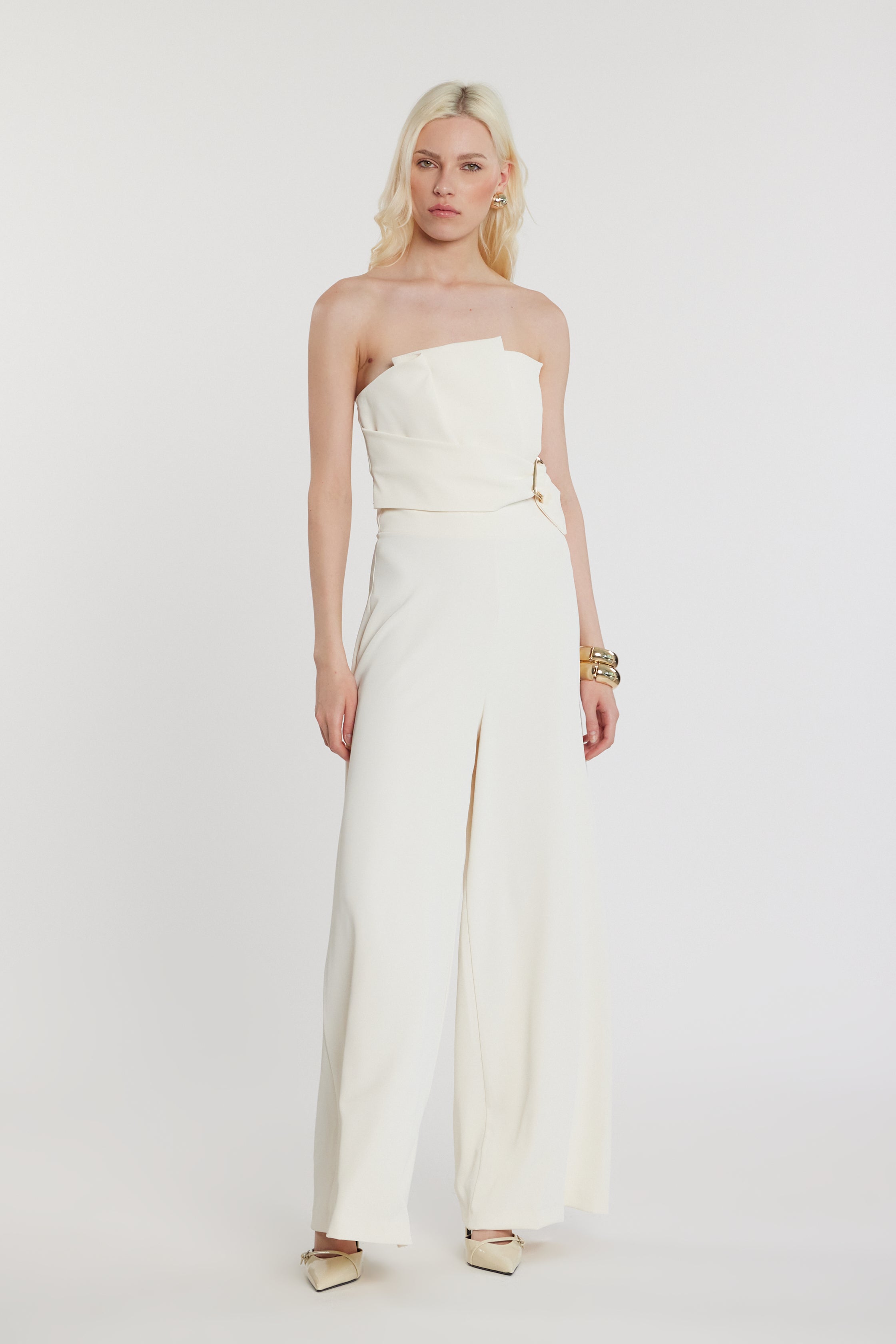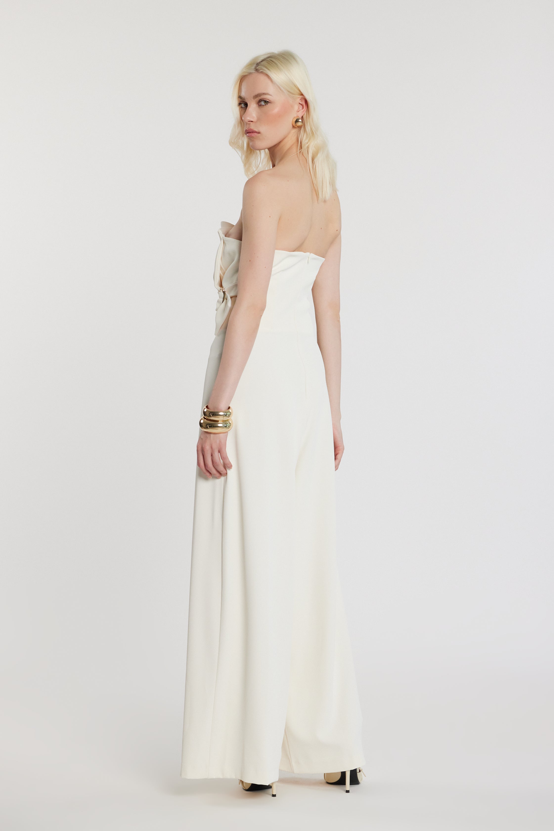 Tuta Uett lunga senza maniche con fascia a ventaglio, pieghe e effetto cintura, un capo scenografico e raffinato. La struttura valorizza il punto vita, mentre le pieghe donano movimento armonioso, perfetta per eventi serali e occasioni speciali.