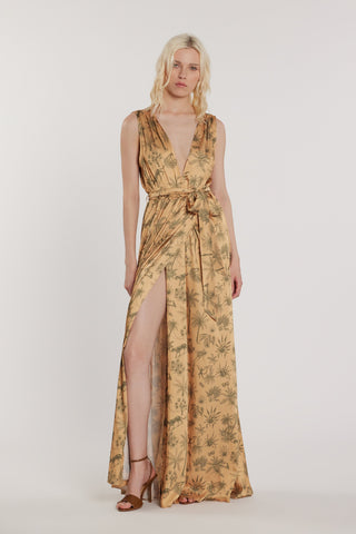 Abito JOHANSSON lungo smanicato doppio scollo profondo con incrocio più cintura fantasia tropical