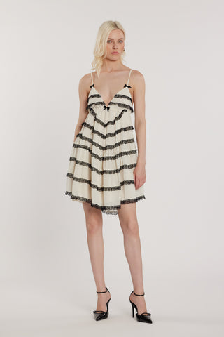 Abito CATHERY lungo smanicato con arricci più balze più inserti pizzo