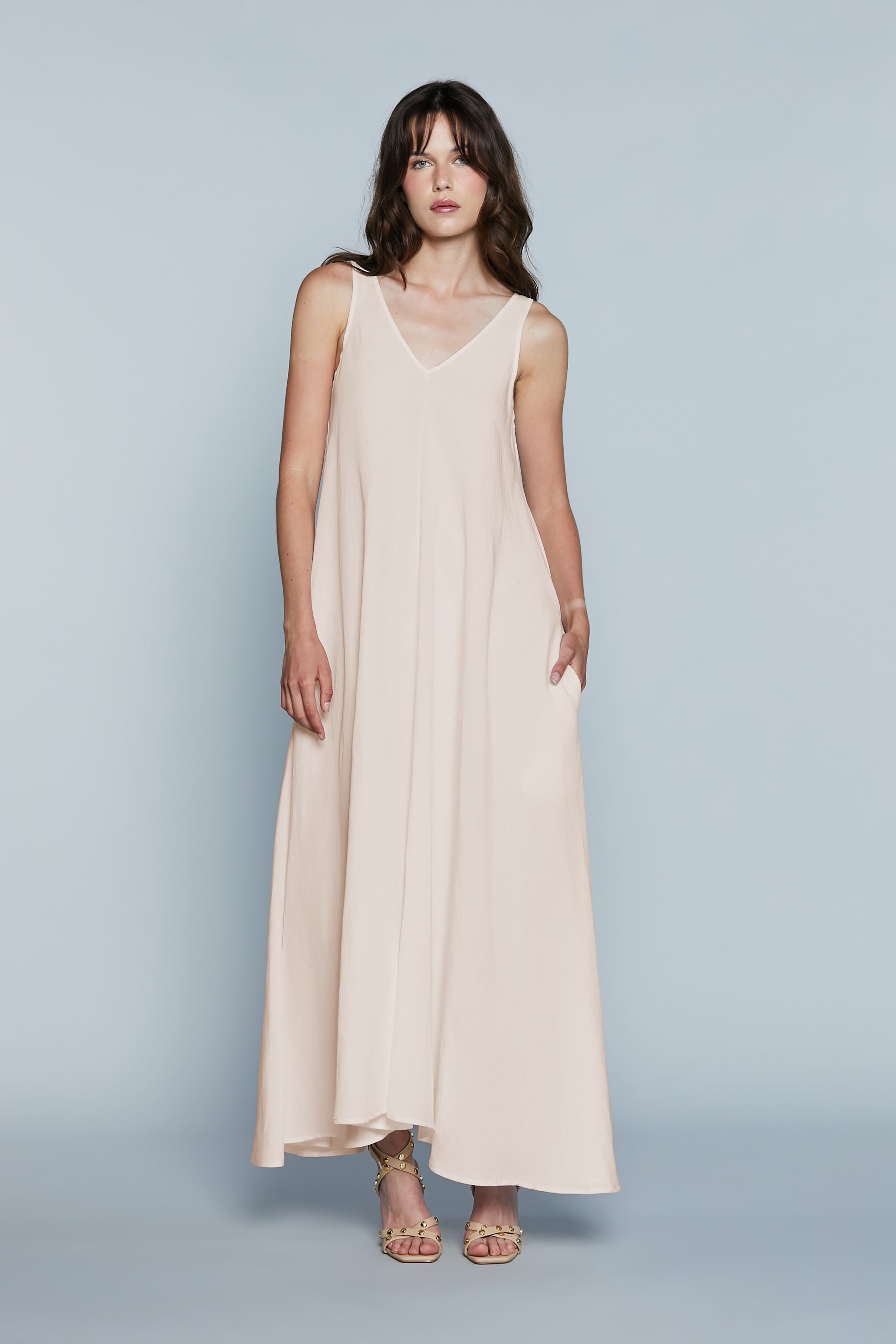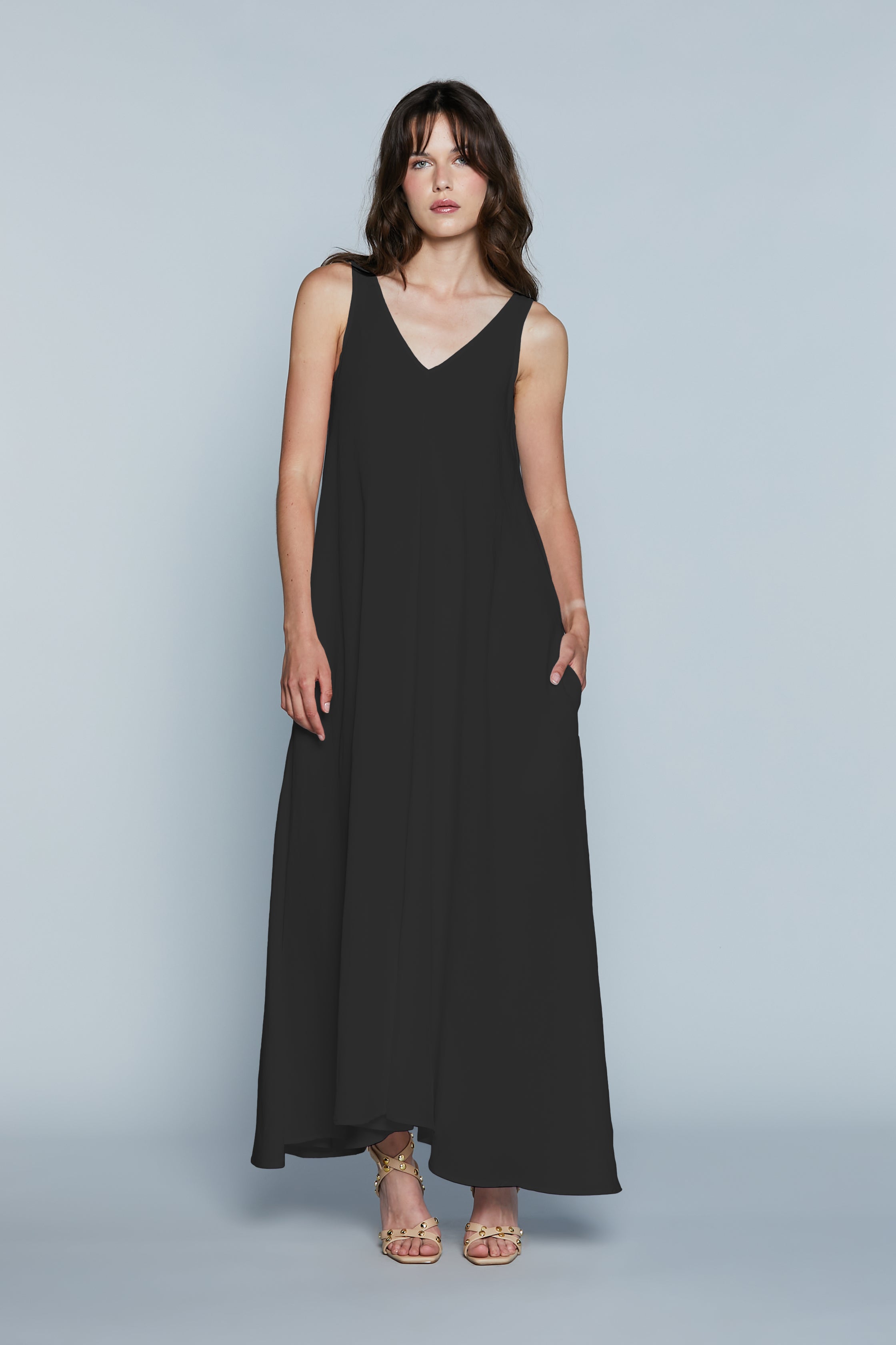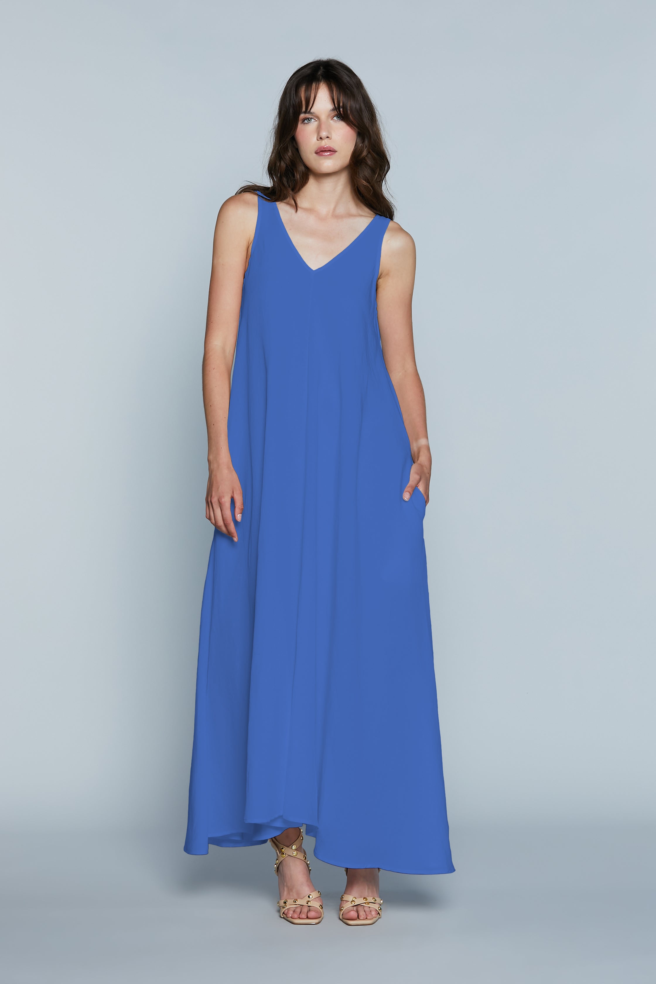 L'abito GHALI è la perfetta fusione di comfort e stile, ideale per un look rilassato ma sofisticato. La lunghezza e il taglio ampio senza maniche donano un'eleganza fresca e minimalista e una vestibilità fluida e moderna che garantisce libertà di movimento. Lo scollo a V sul davanti e sul dietro slancia e valorizza il décolleté. Le tasche laterali aggiungono un dettaglio casual-chic.