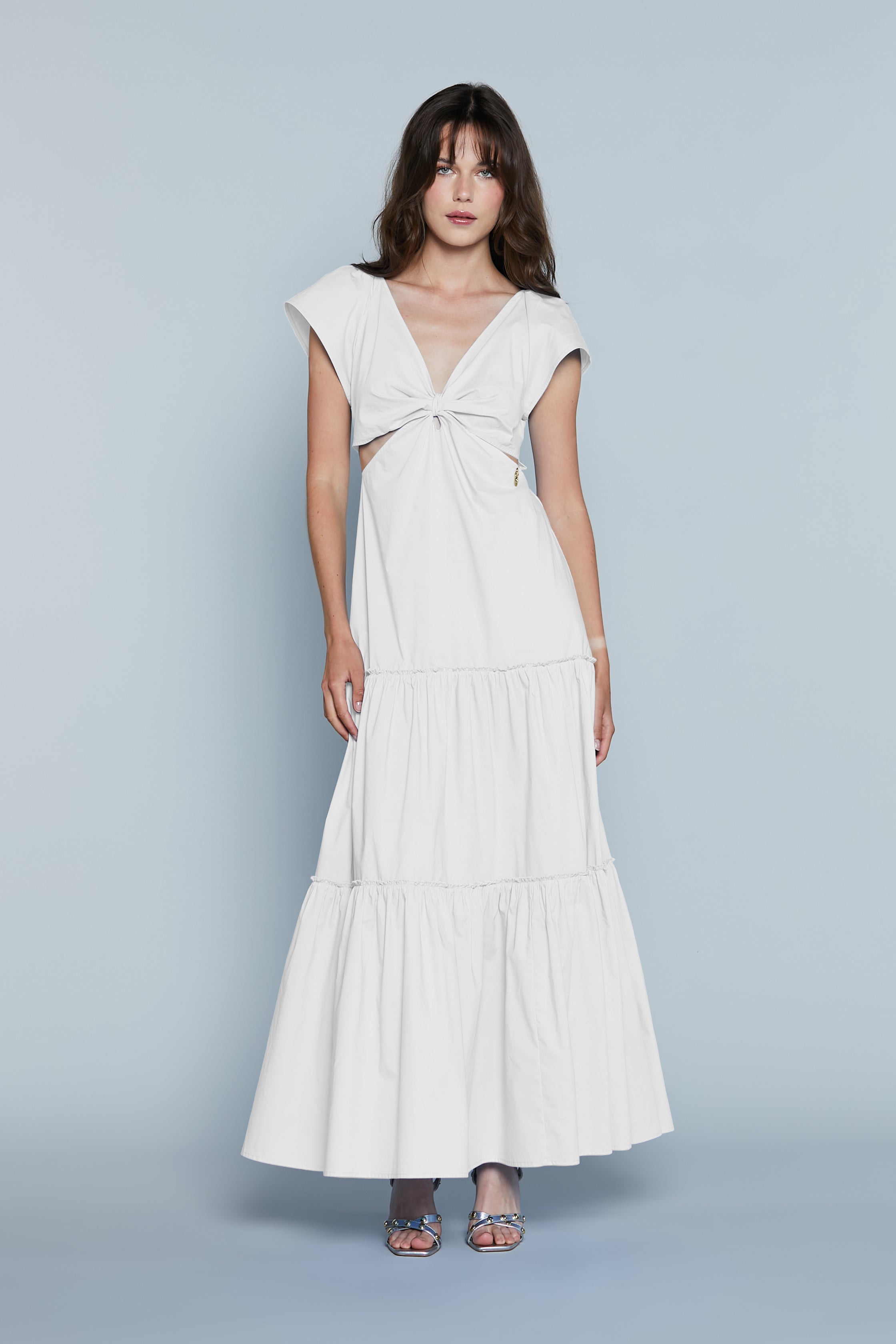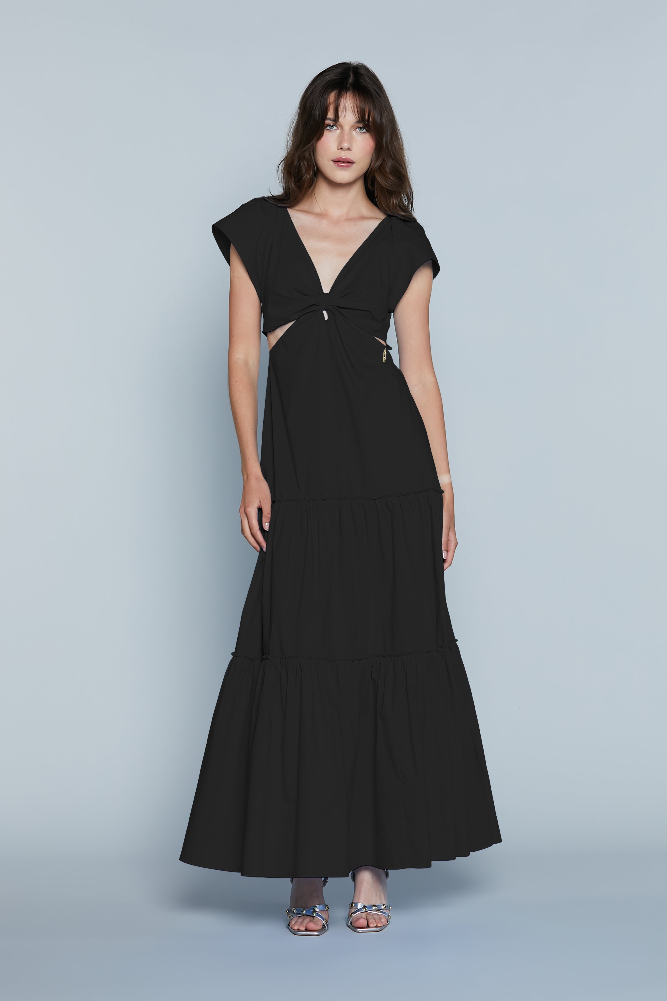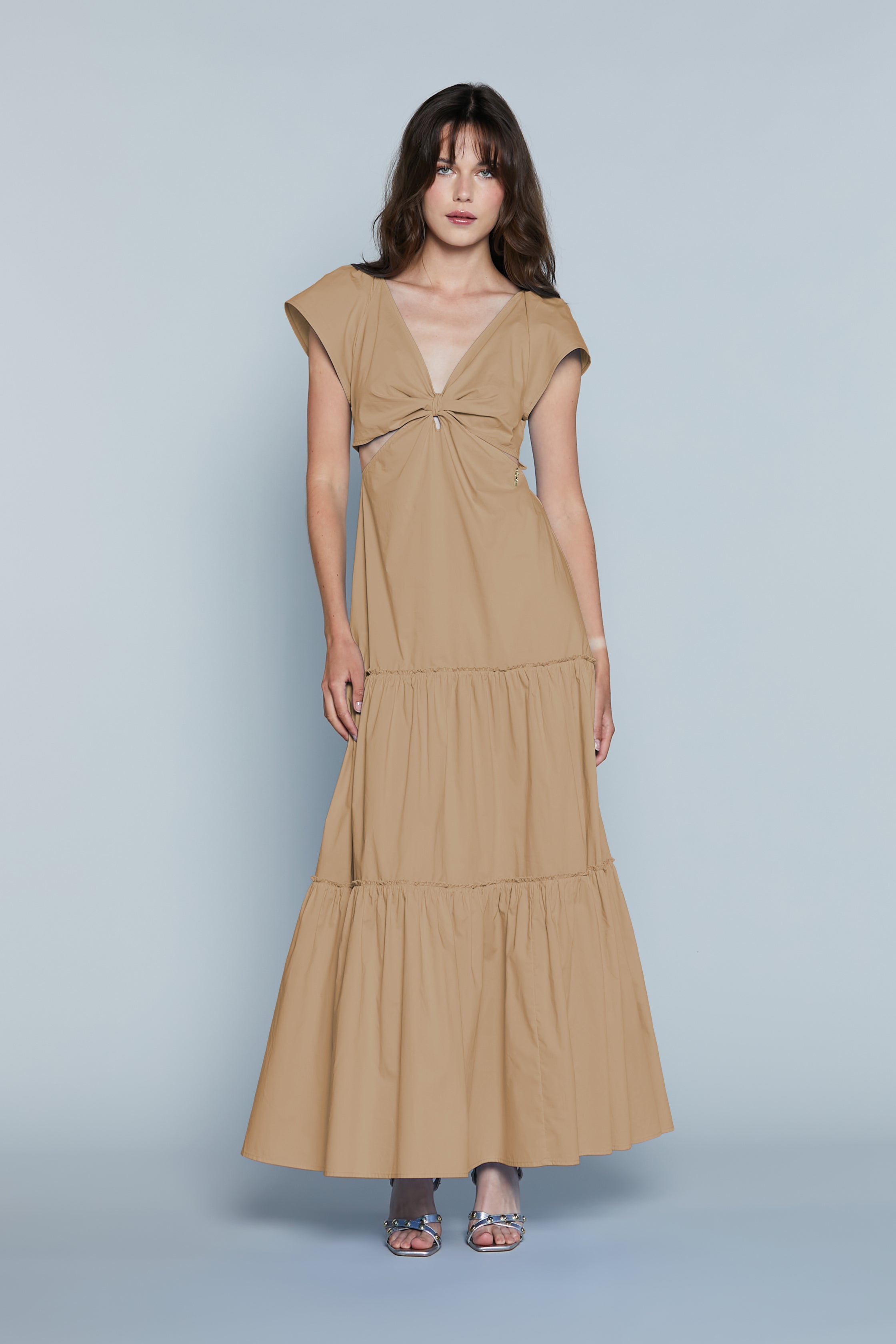 L'abito MAHMOOD è un capo dallo stile elegante e audace, ideale per chi cerca un look pratico ma sofisticato ma con un tocco di originalità. Le mezze maniche e lo scollo a V donano una linea raffinata, mentre il nodo sul seno aggiunge un dettaglio di femminilità e charme. Le aperture sui fianchi e le balze sul fondo conferiscono movimento e leggerezza, creando un abito perfetto per giornate speciali o serate eleganti. Un mix perfetto di stile e sensualità.