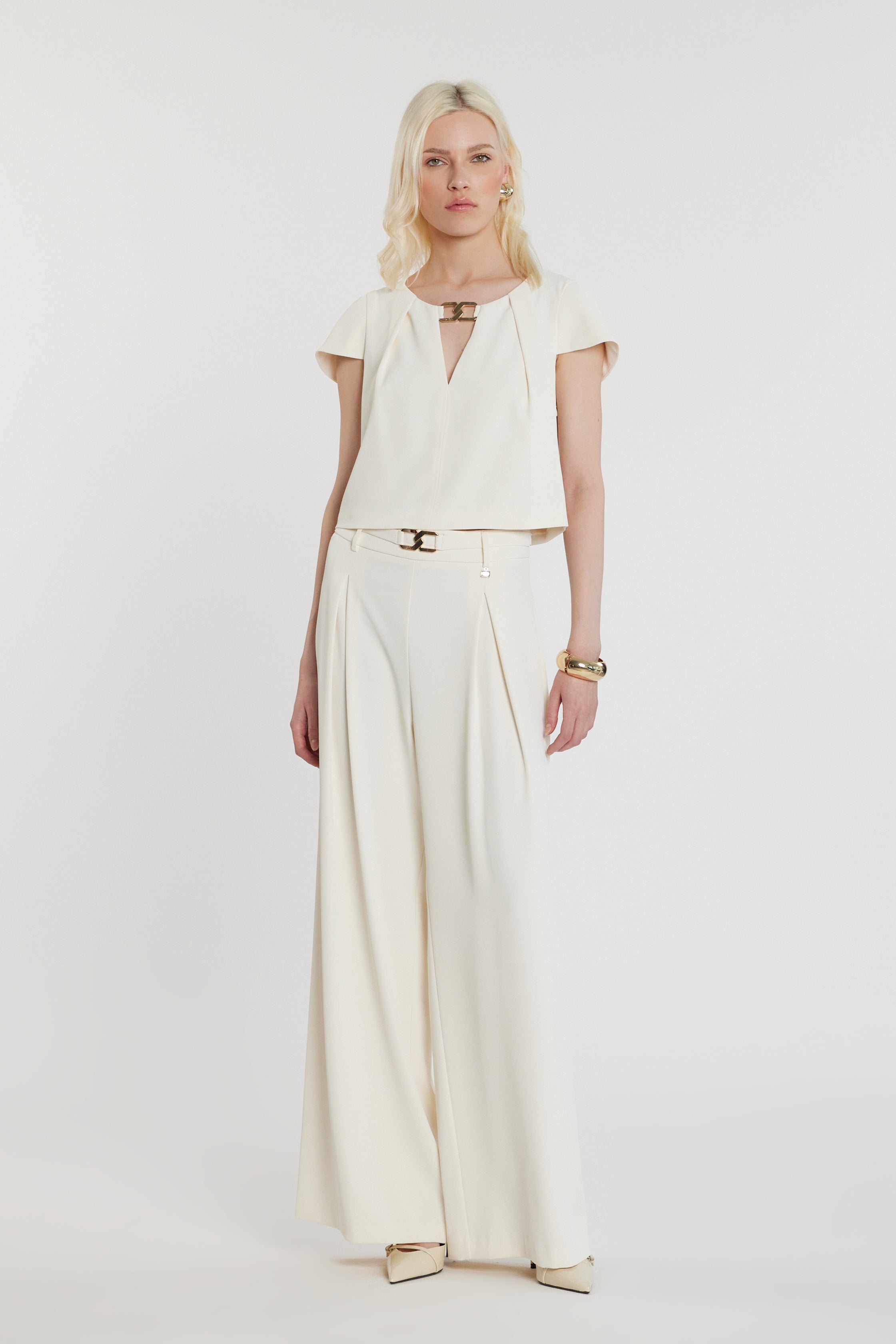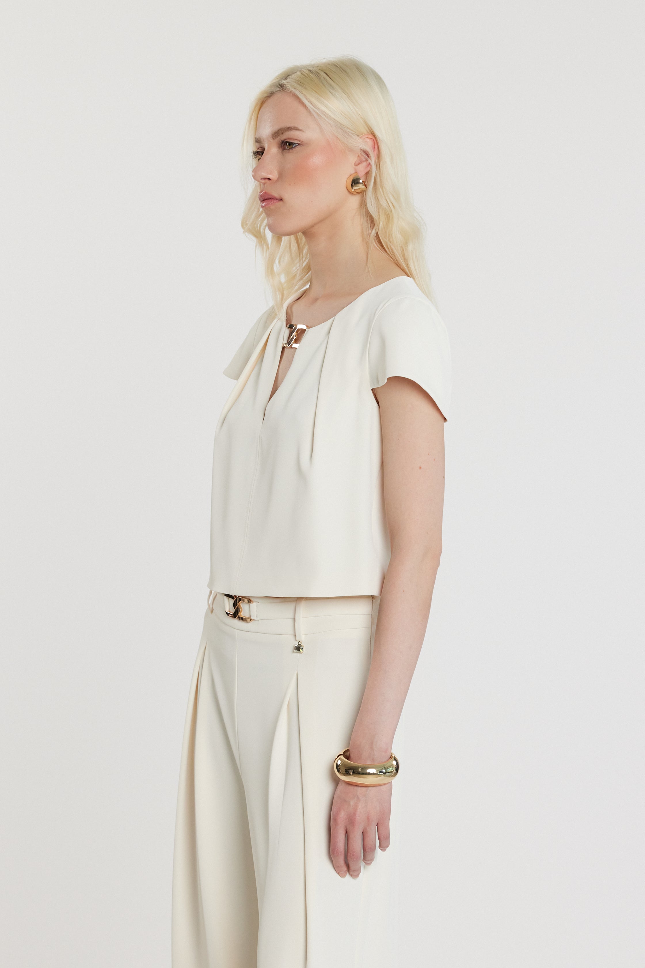 Blusa Capucine corta maniche lunghe con goccia e passante logo, un modello sofisticato e luminoso. La goccia aggiunge eleganza, mentre il logo conferisce modernità e charme couture. Perfetta per outfit day-to-night.