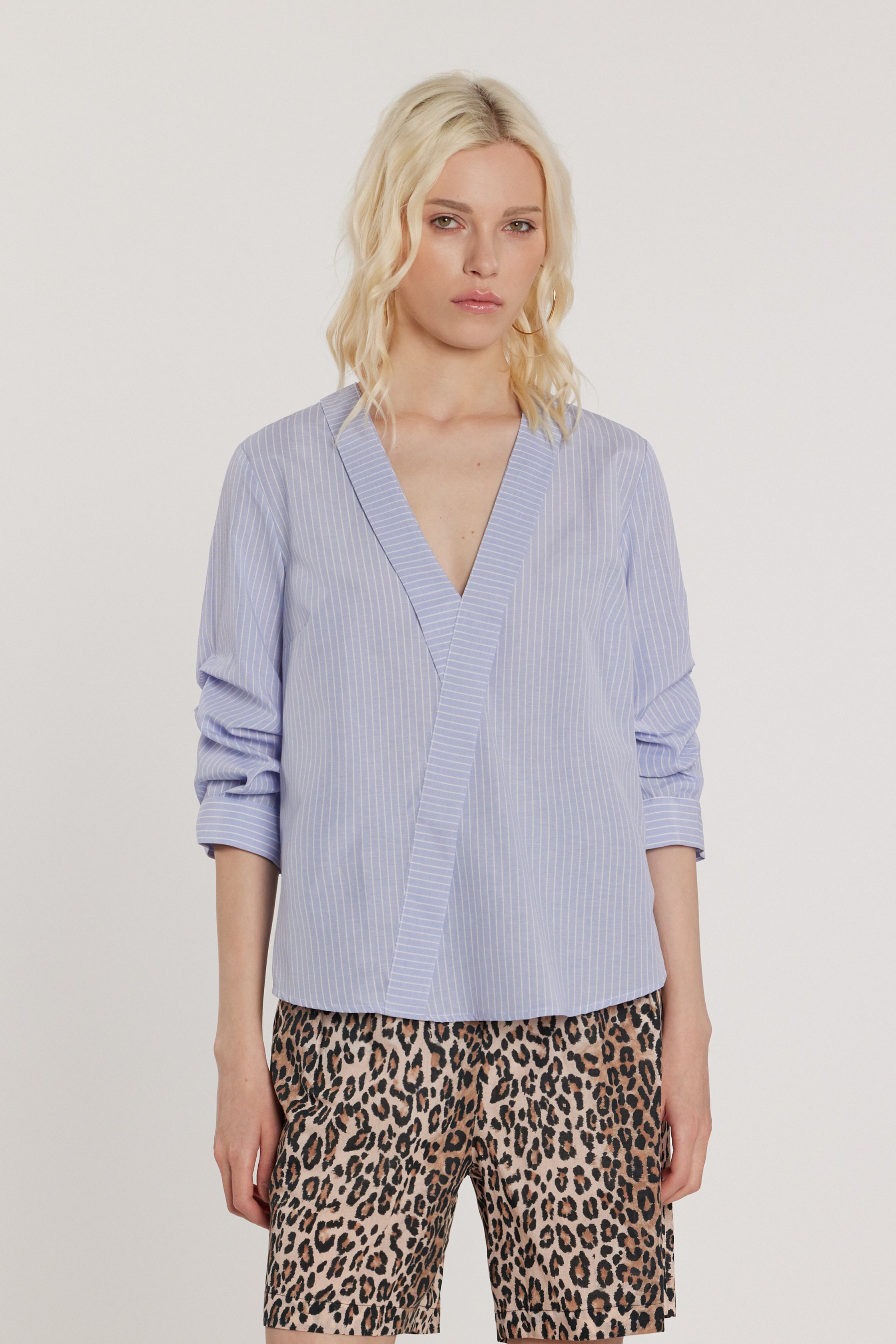 Blusa Clerys maniche tre quarti effetto arricciato con scollo incrociato e risvolto a righe, un modello romantico e sofisticato. Gli arricci e lo scollo incrociato valorizzano la silhouette, mentre i dettagli couture conferiscono charme discreto.