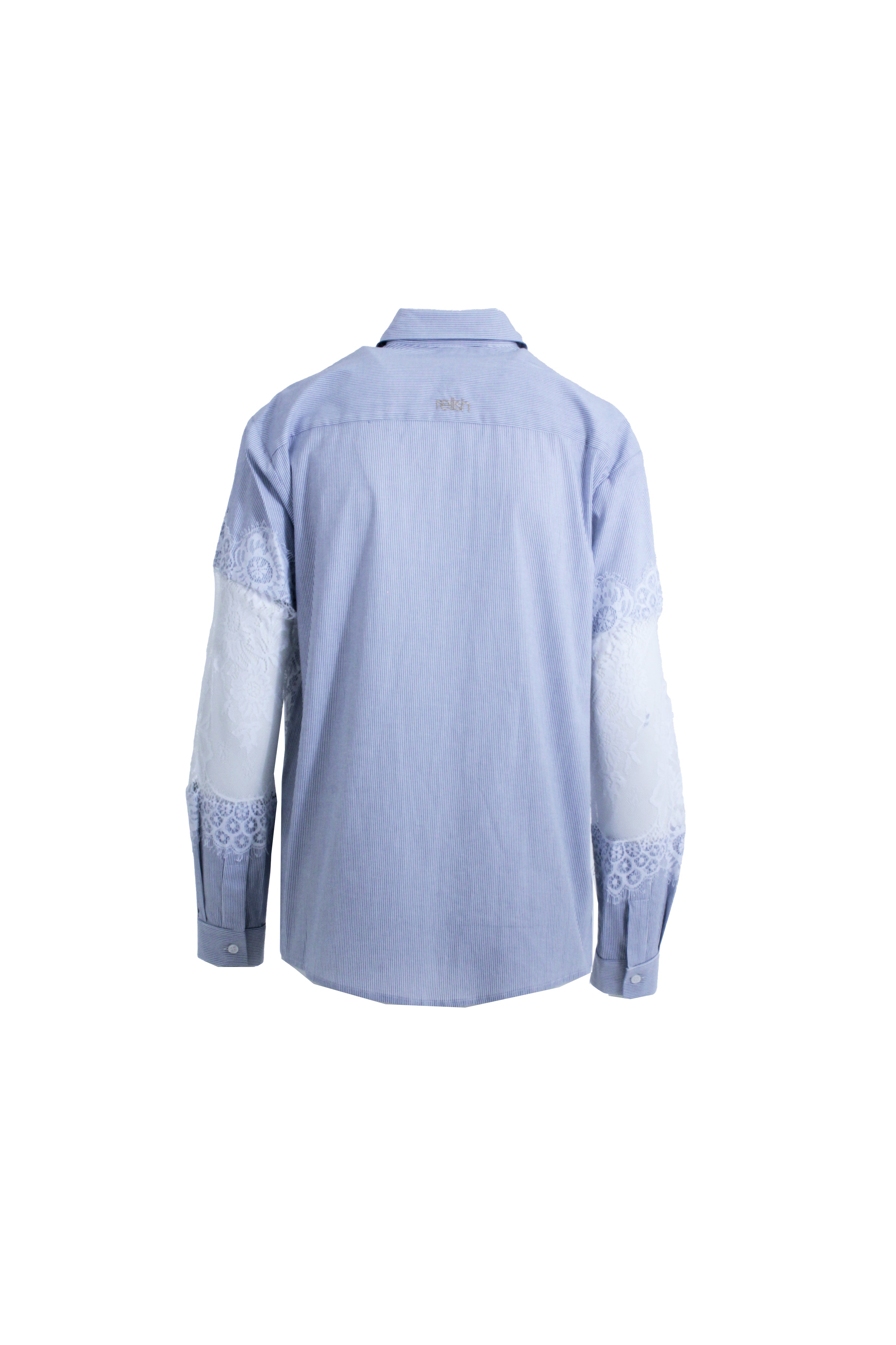 Camicia Charlize maniche lunghe con inserti in pizzo sulle maniche e righe sul corpo, un capo raffinato e originale. Il pizzo dona romanticismo, mentre le righe creano struttura e movimento couture. Perfetta per look da giorno eleganti o serate raffinate.