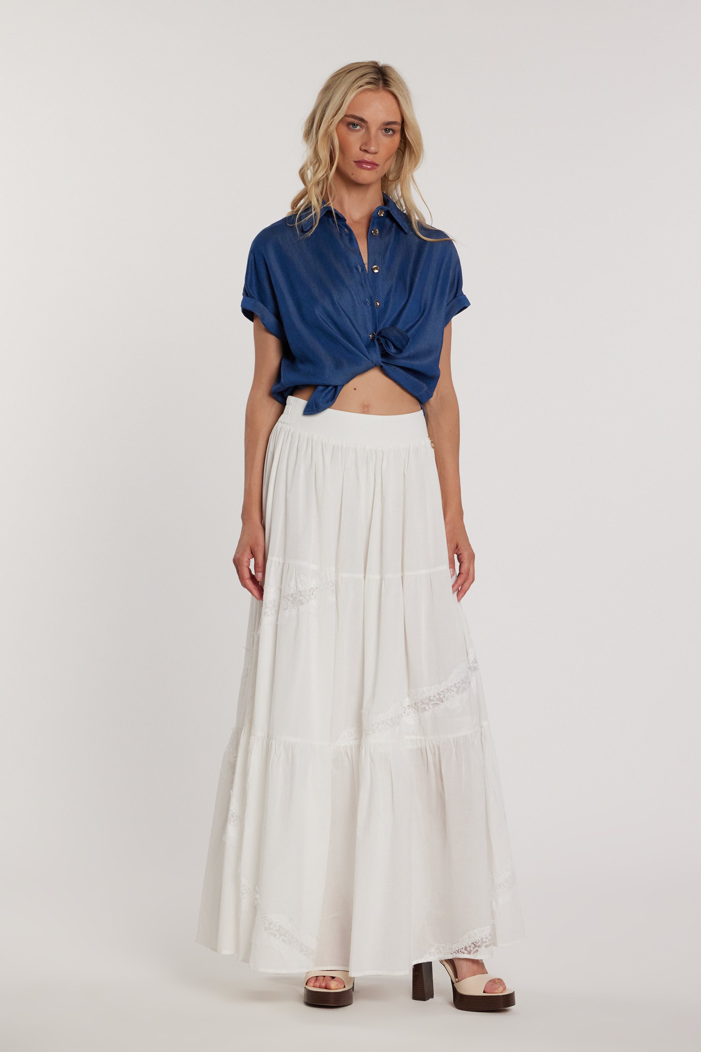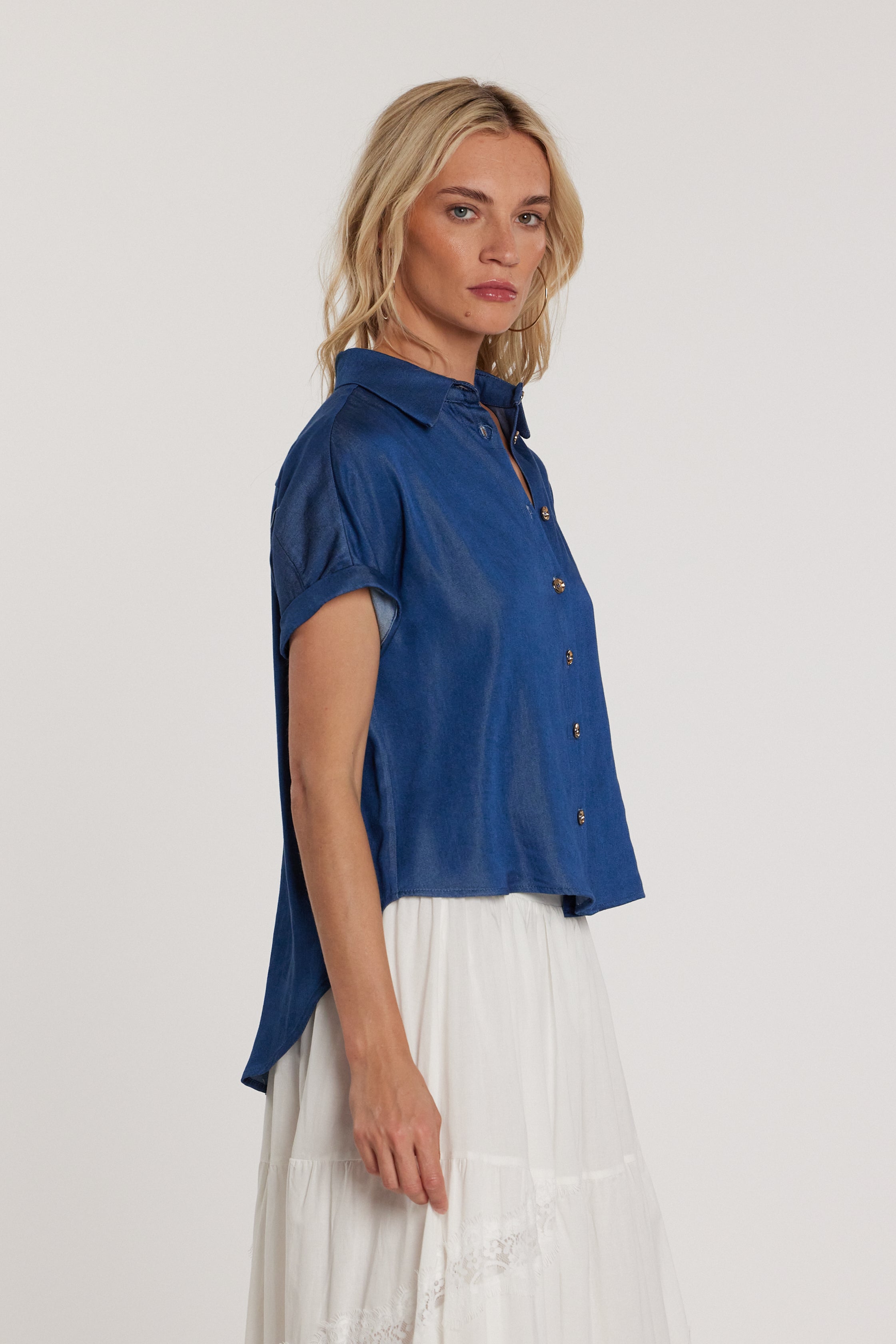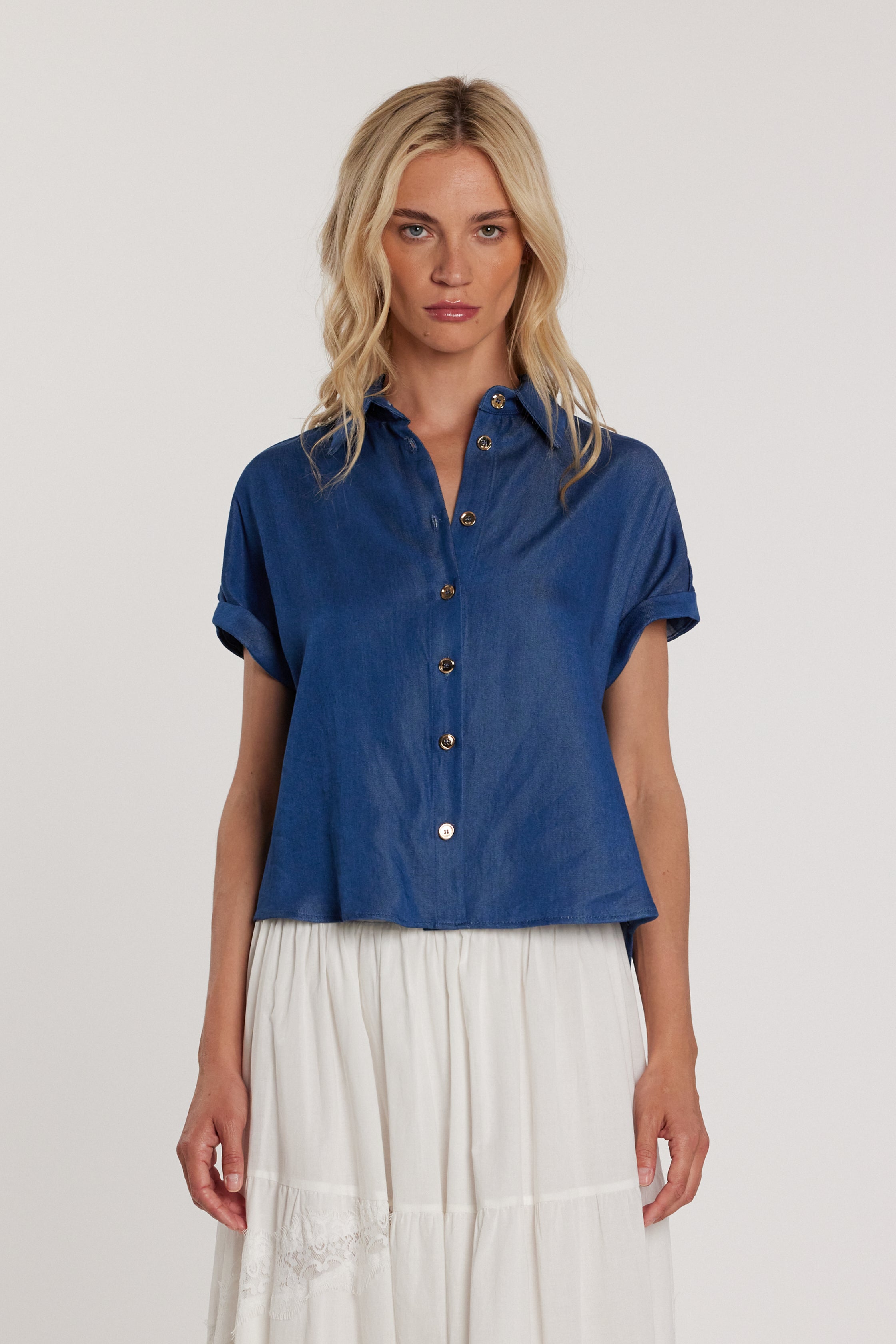 Camicia Cris senza maniche con risvolto asimmetrico in denim, un modello contemporaneo e originale. L’asimmetria crea movimento e charme couture discreto, mentre il denim conferisce carattere e modernità.