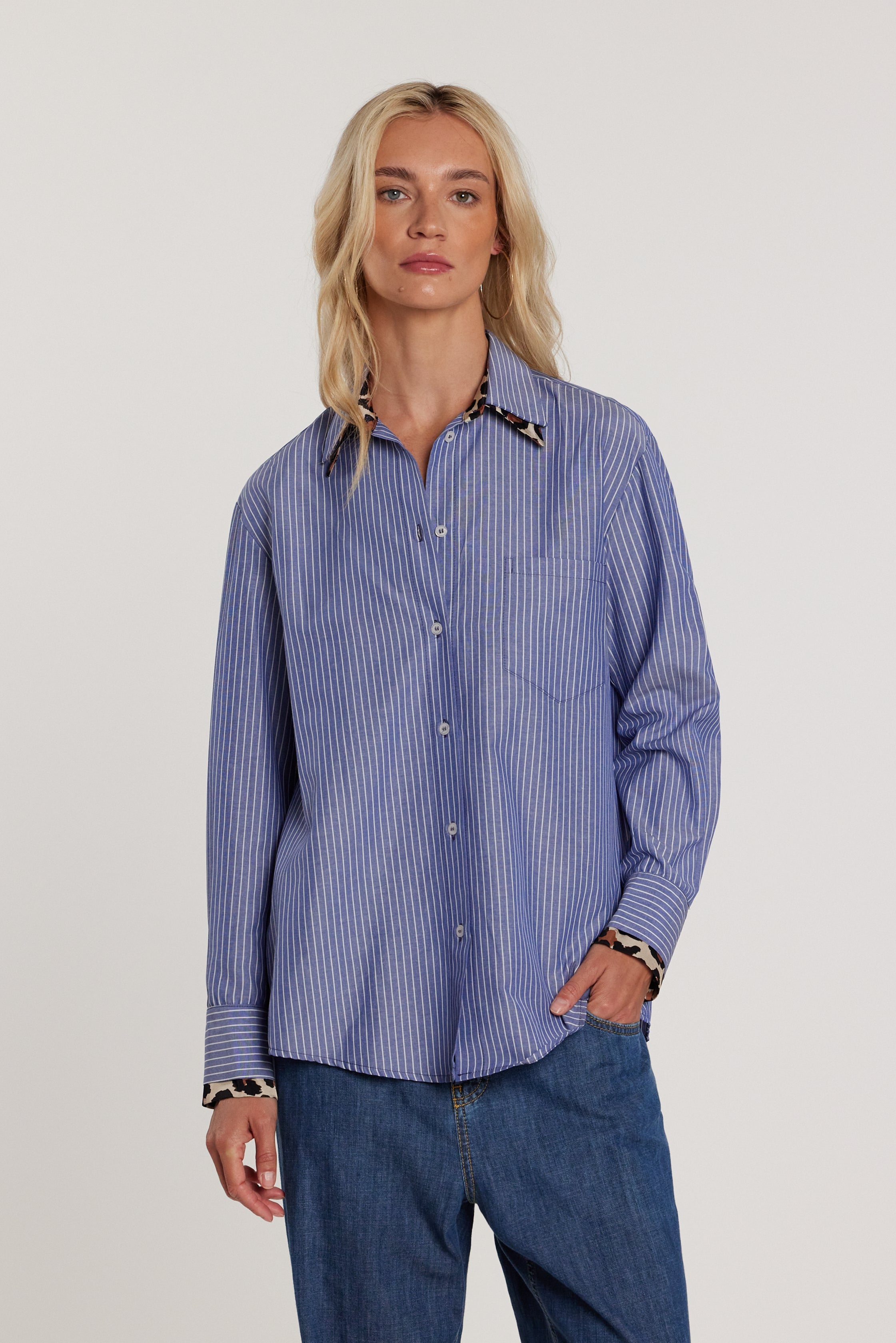 Camicia Martine maniche lunghe con doppio polso, fantasia animalier e tasca a punta a righe, un modello sofisticato e femminile. La fantasia e i dettagli couture aggiungono carattere e stile, valorizzando la silhouette con charme discreto.