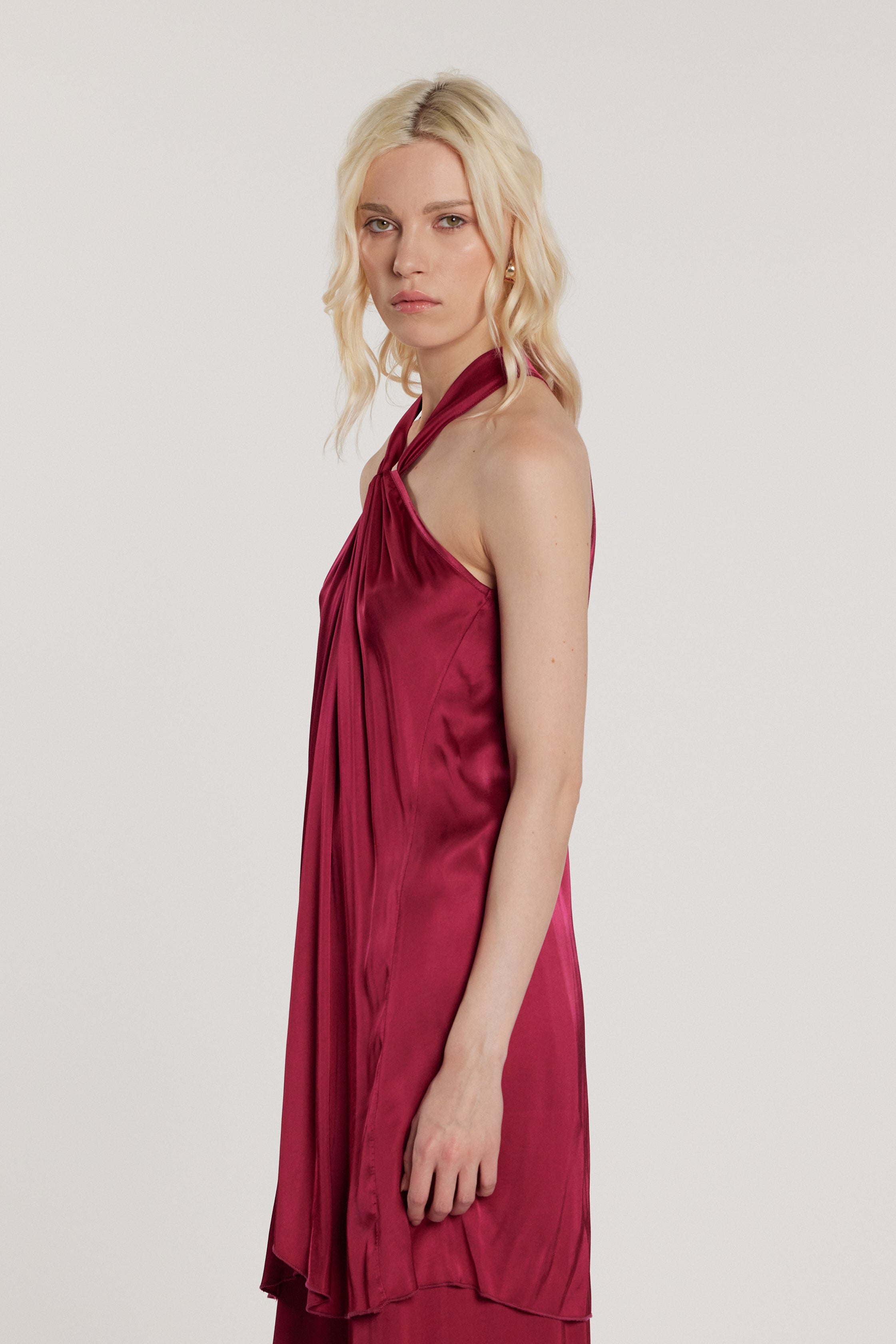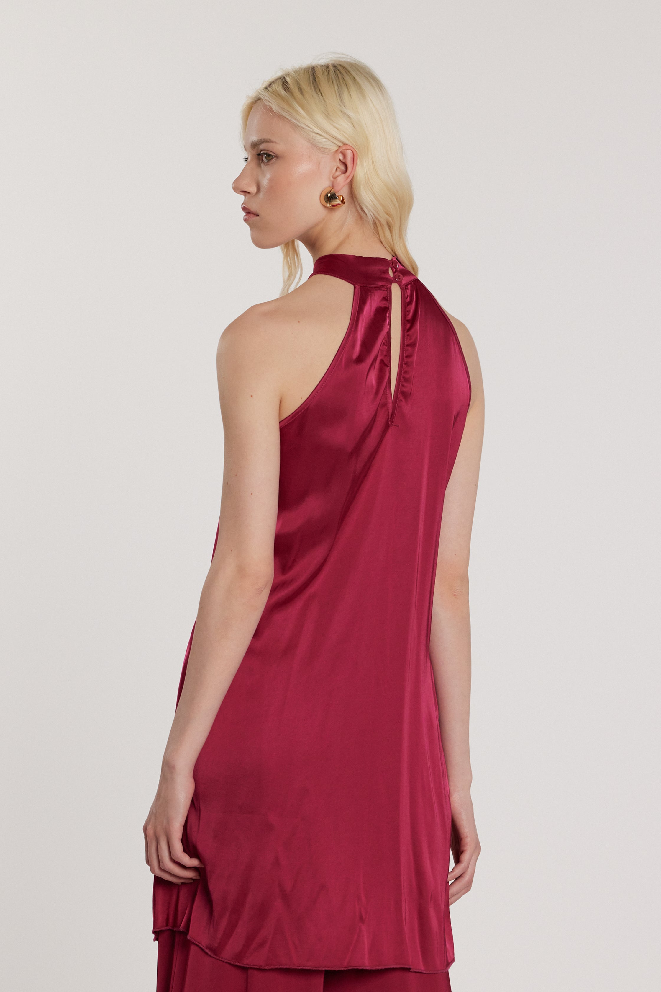 Top Apart lungo senza maniche con collo incrociato, goccia e bottoncini sulla schiena, un modello raffinato e scenografico. Il collo incrociato e i dettagli sulla schiena creano movimento e charme couture, perfetto per cocktail o eventi serali eleganti.