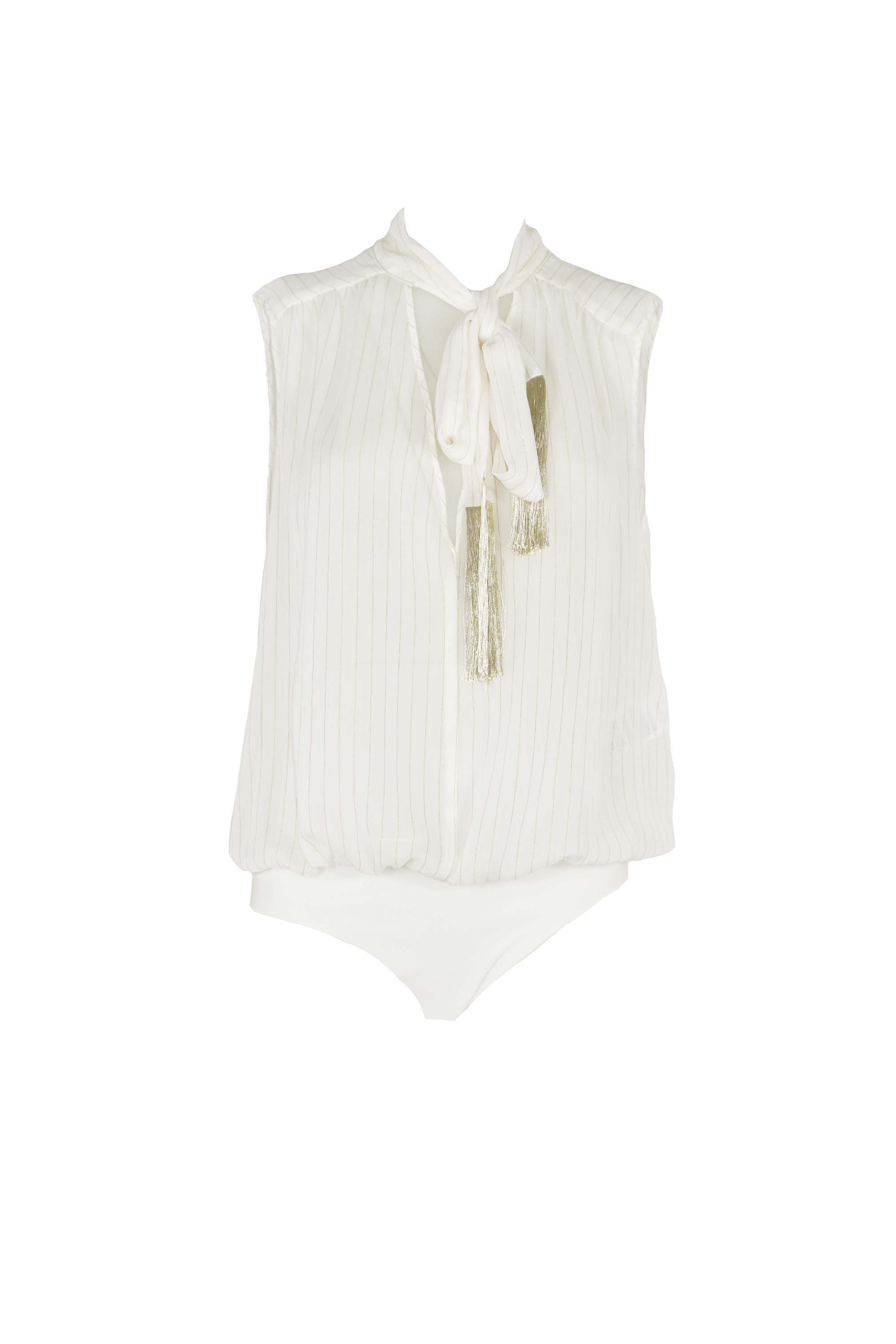 Body STRIMBLIK senza maniche con scollo a V profondo più fusciacca con frange riga oro