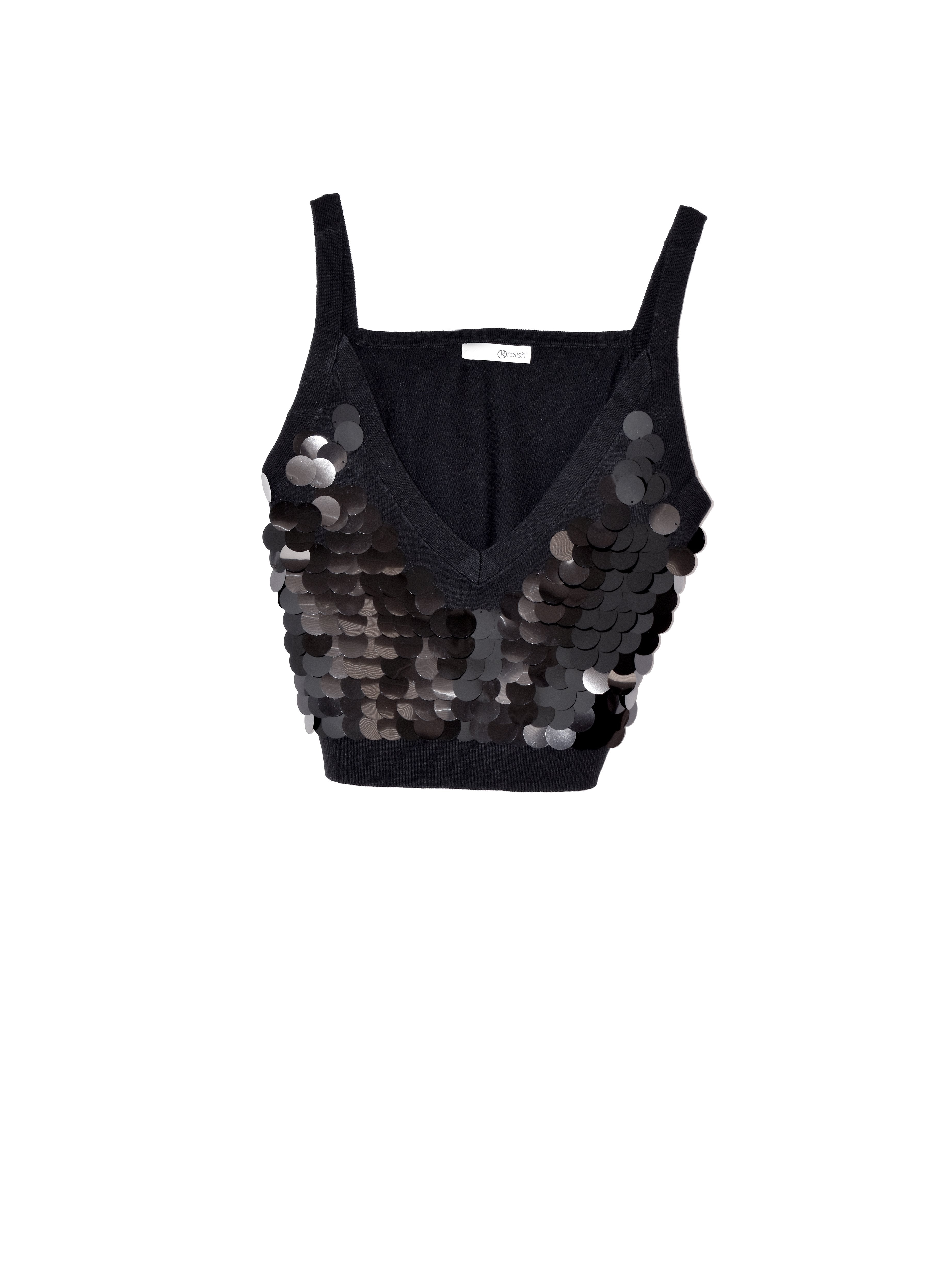 Crop-top MALUBI dalle grandi paillettes a specchio ,tinta su tinta, si presta benissimo anche come sottogiacca vedo non vedo.