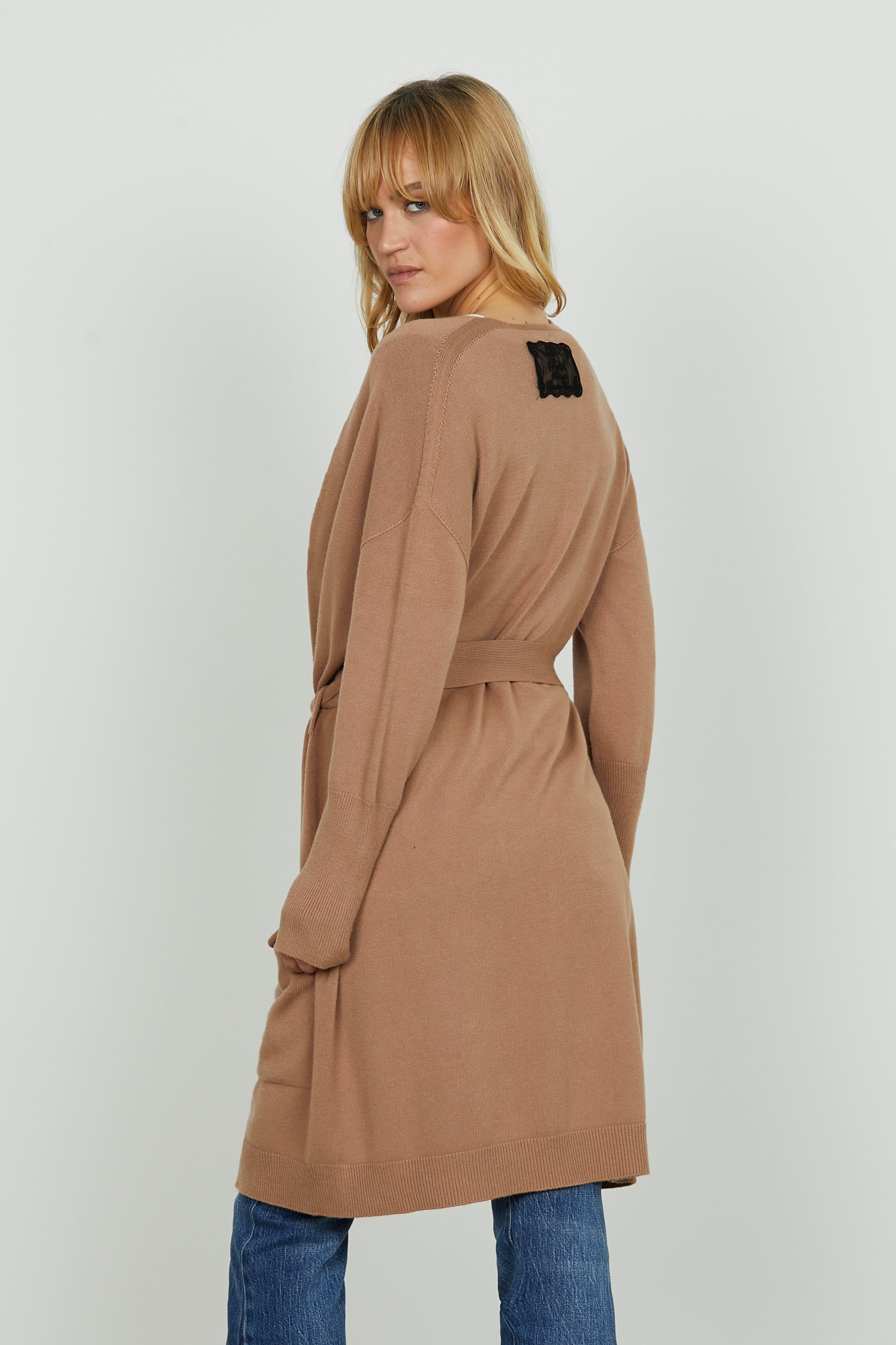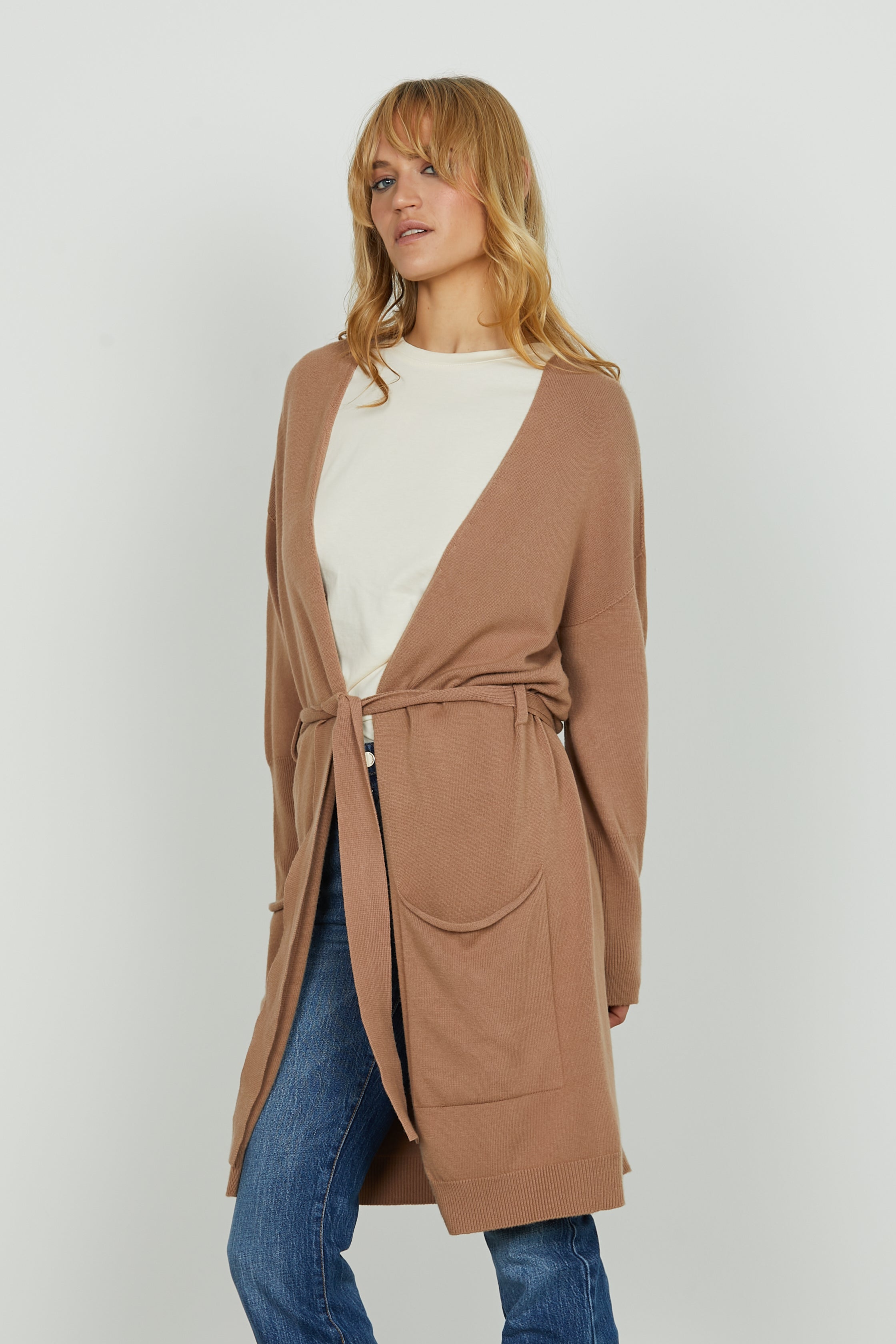 Il cardigan lungo MARNOS è il capo che non può mancare nella tua valigia (o nel tuo guardaroba): morbido, avvolgente, con tasche pratiche e una cintura in vita per definire la silhouette. Vestibilità relaxed ma femminile.