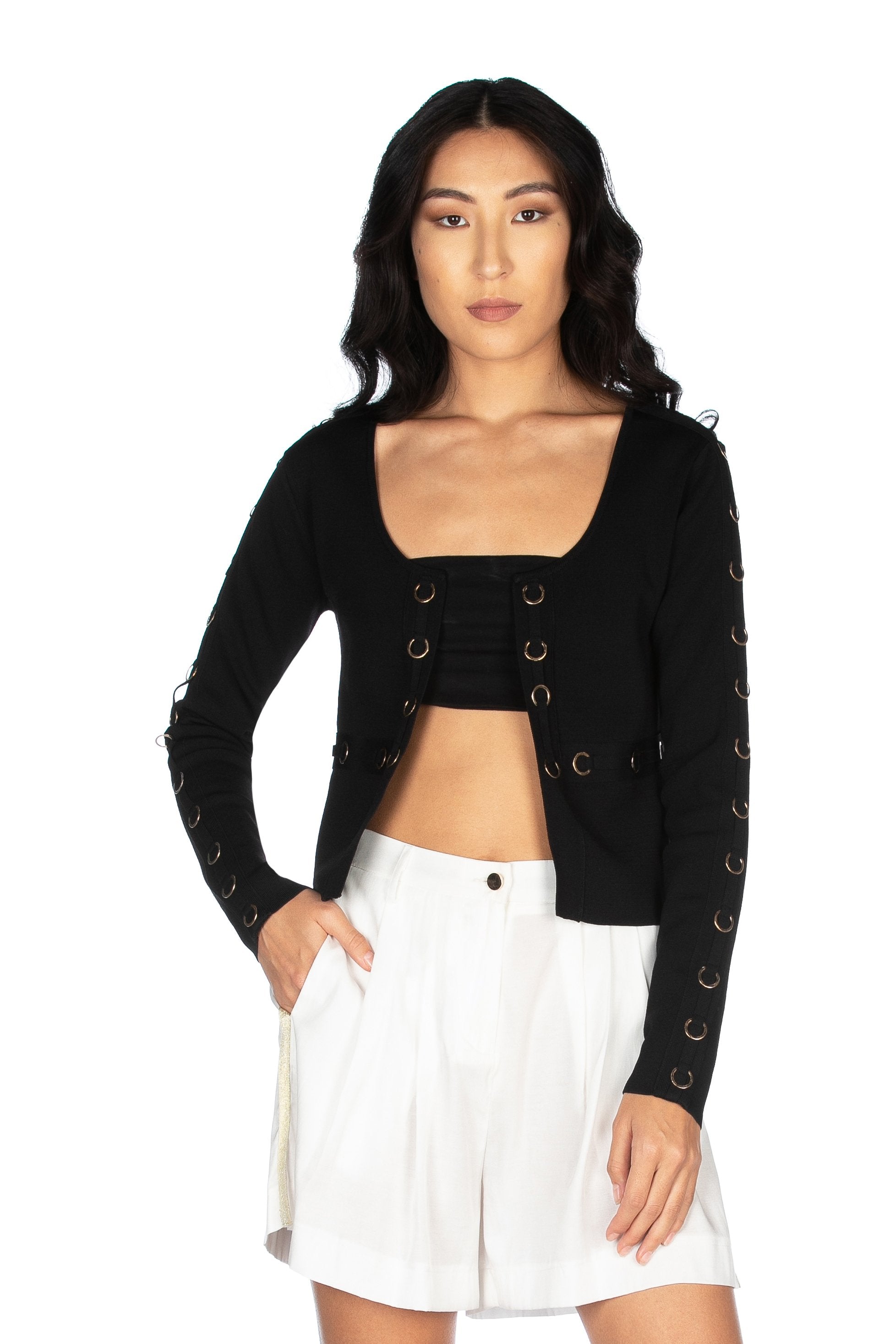 Gli anelli oro con inserti in tessuto rendono questo cardigan un pezzo unico del tuo guardaroba. Perfetto da abbinare sia ai look casual che eleganti ma soprattutto insieme al Body JAPAN della della stessa rifinitura.