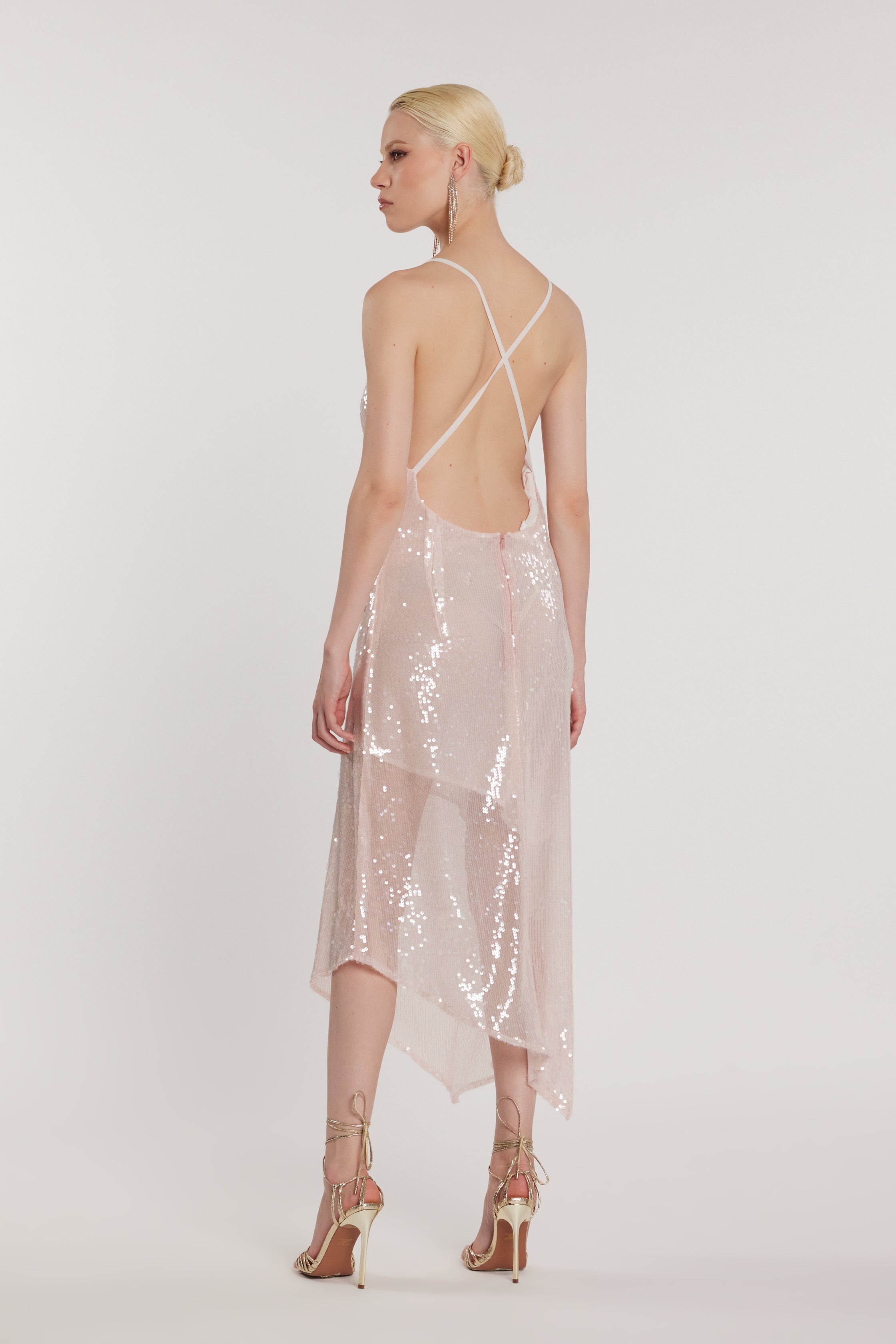 Abito Beloved midi con collo morbido e top incrociato sul retro, interamente ricoperto di paillettes scintillanti, un modello glamour che cattura la luce ad ogni movimento. Perfetto per serate eleganti o eventi di gala, questo abito trasforma ogni look in un’esplosione di femminilità, luce e charme couture, ideale per chi ama brillare con stile sofisticato.