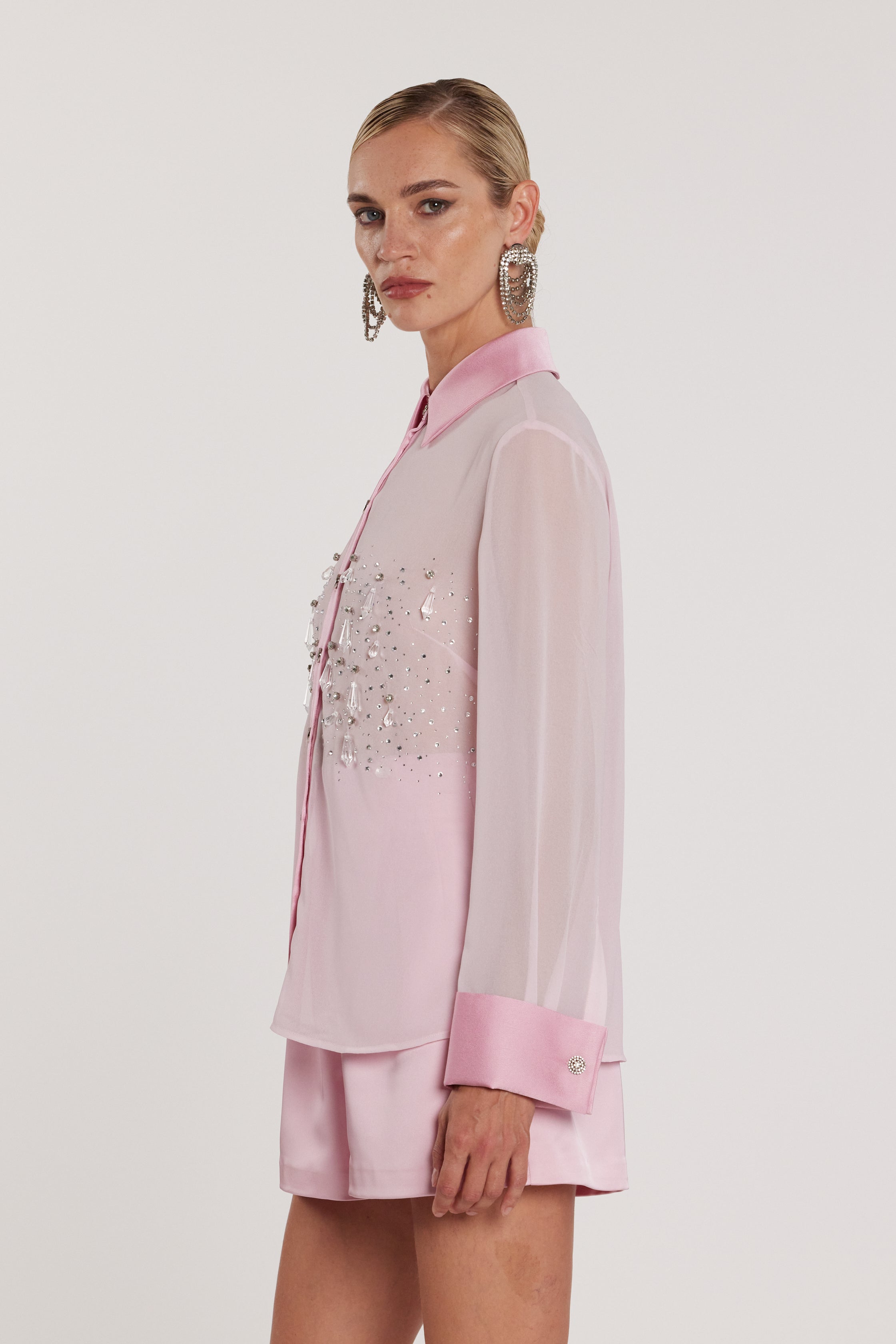 Eleganza pura: inserti in raso sulle maniche, gemelli scintillanti e applicazioni in strass con pendenti rendono questa camicia il capo perfetto per brillare in ogni occasione speciale.