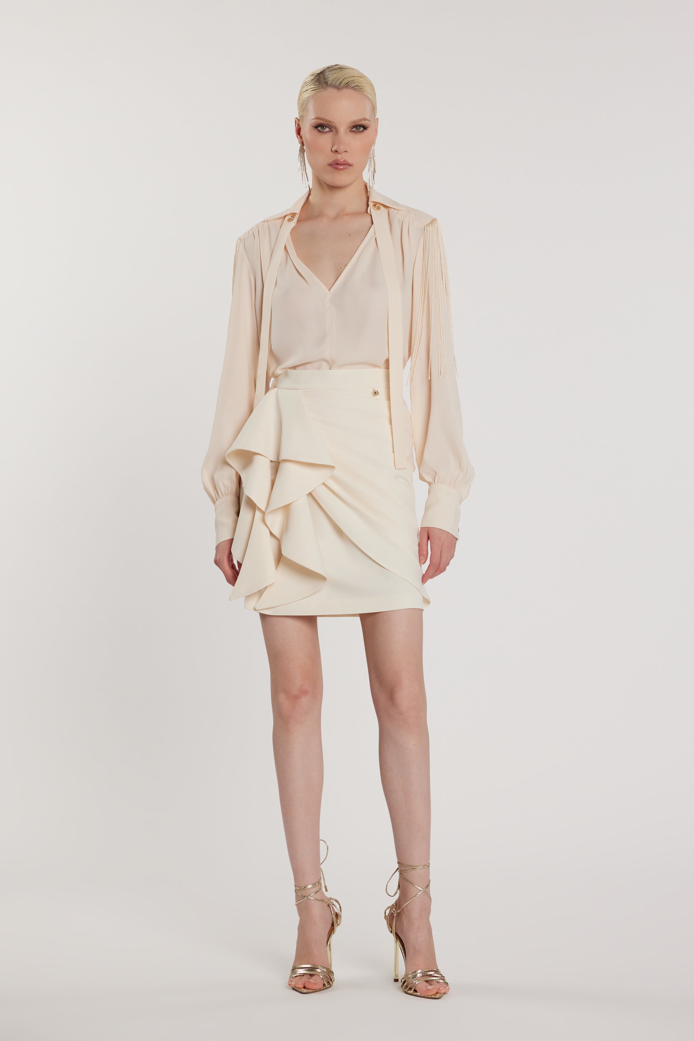 Design moderno e femminile: le pieghe donano movimento e volume, mentre il pannello frontale aggiunge struttura e carattere. Una gonna versatile, perfetta per creare look eleganti di giorno e outfit più decisi per la sera.