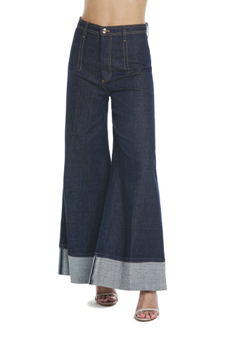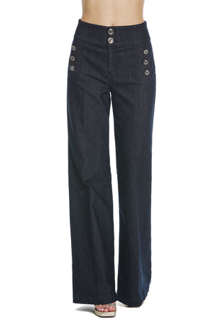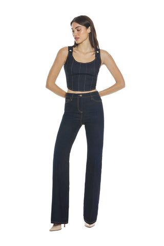 Panta LAGERTHA vita alta con bustino alto più tasche più bottoni gamba larga denim blu