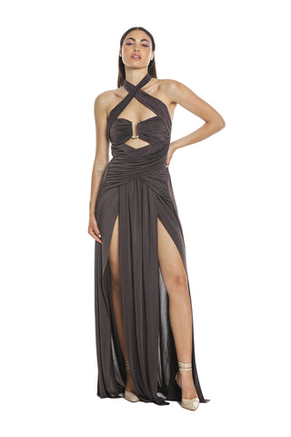 Abito ADHAFERA lungo con allaccio collo più anello più incrocio arricci più aperture