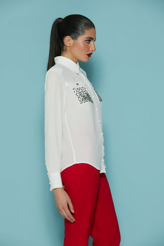 Camicia GRAZIA manica lunga con inserti raso più tasche più applicazione perline