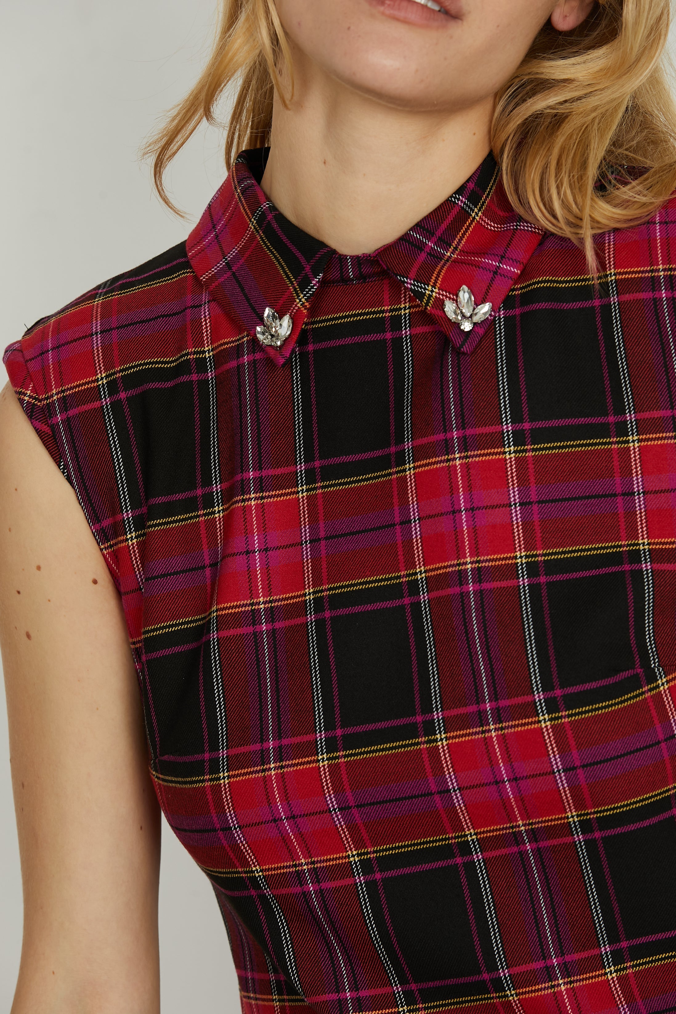 L’Abito ISIDORIS è caratterizzato da una particolare fantasia a quadri su tutto il capo, che dona un tocco rock e contemporaneo insieme. Il colletto impreziosito da pietre aggiunge un dettaglio luminoso e sofisticato. La gonna con pieghe completa il look con movimento e femminilità. Perfetto per chi vuole un outfit distintivo e chic in ogni occasione.