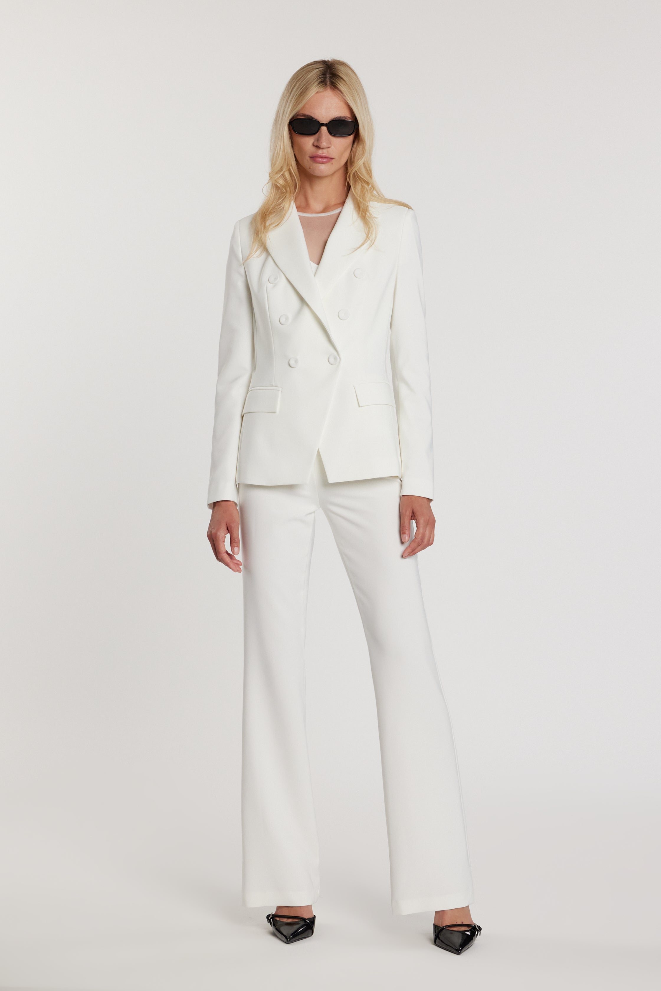 Giacca Belsa maniche lunghe doppio petto con tasche e patte, una giacca dal gusto elegante e strutturato. Il doppio petto enfatizza la silhouette con equilibrio, mentre i dettagli sartoriali rendono il capo ideale per outfit formali, cerimonie o contesti professionali di alto livello.
