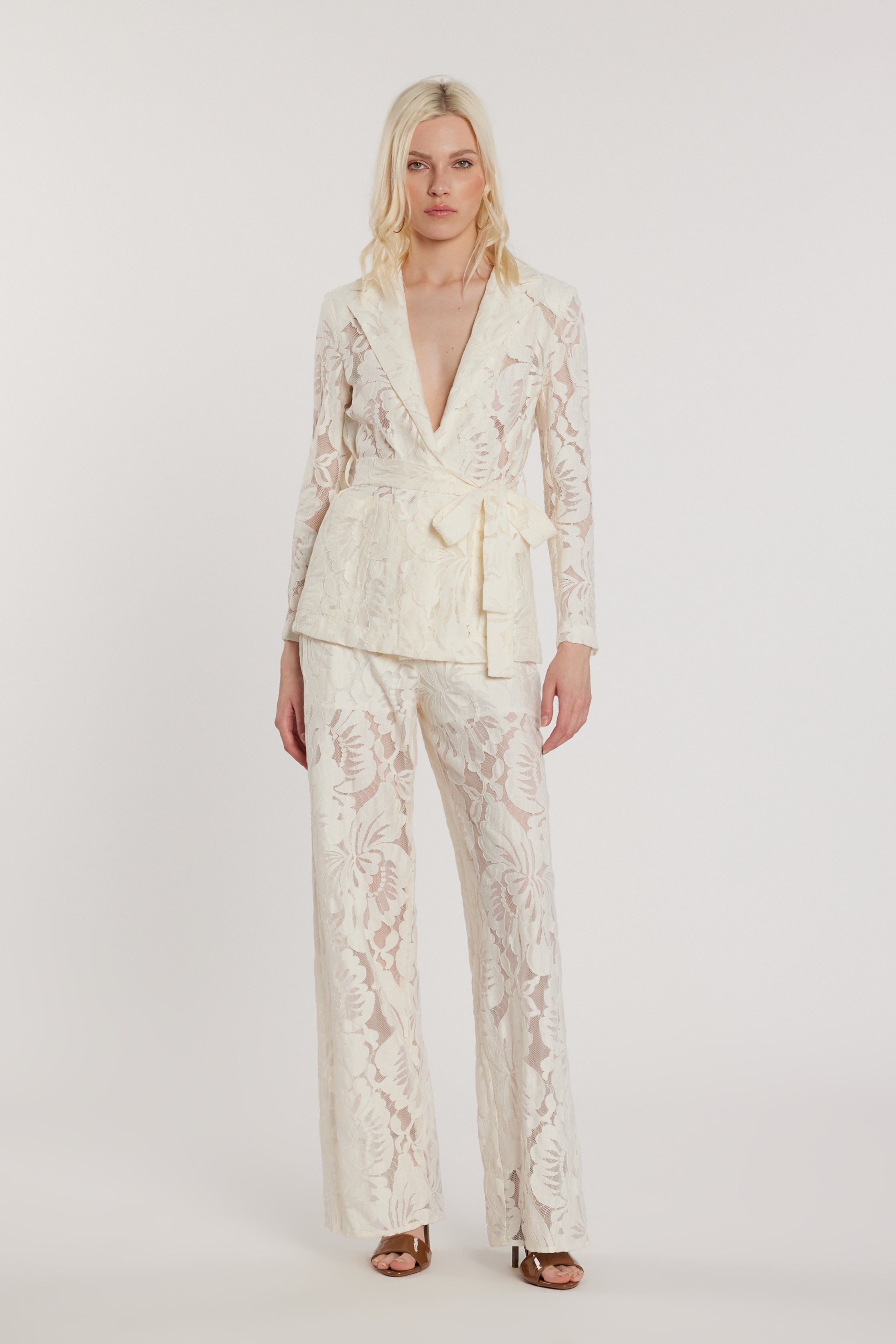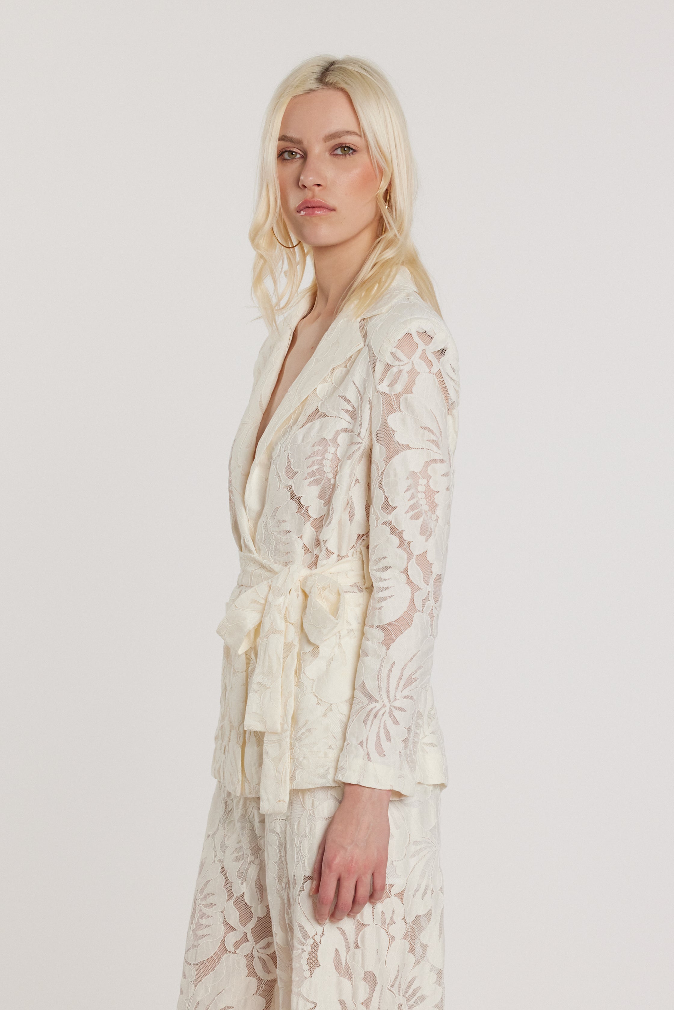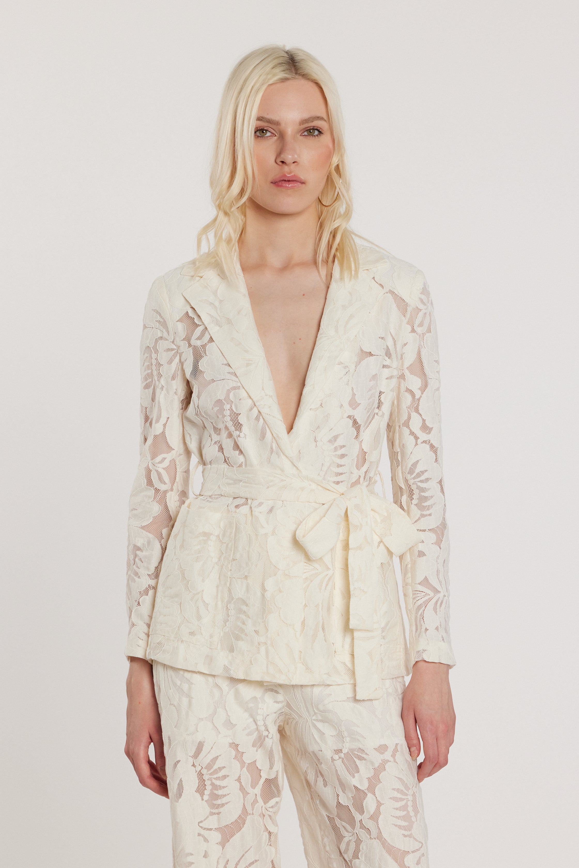 Giacca Rampling maniche lunghe con tasche toppa, cintura e dettagli in pizzo, un modello romantico e sofisticato. Il pizzo aggiunge delicatezza, mentre la cintura valorizza la vita con eleganza, rendendola ideale per look ricercati e femminili.