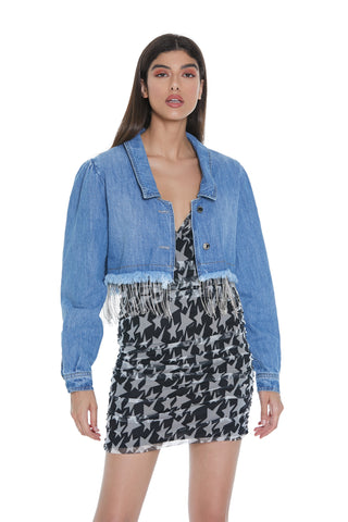 Giubbino NAOKO_STRASS corto manica lunga ampio sfrangiato più catena strass denim