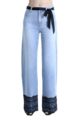 Pantalone ELLELONG_27 vita media con cintura più applicazioni pizzo fondo straight fit denim blu