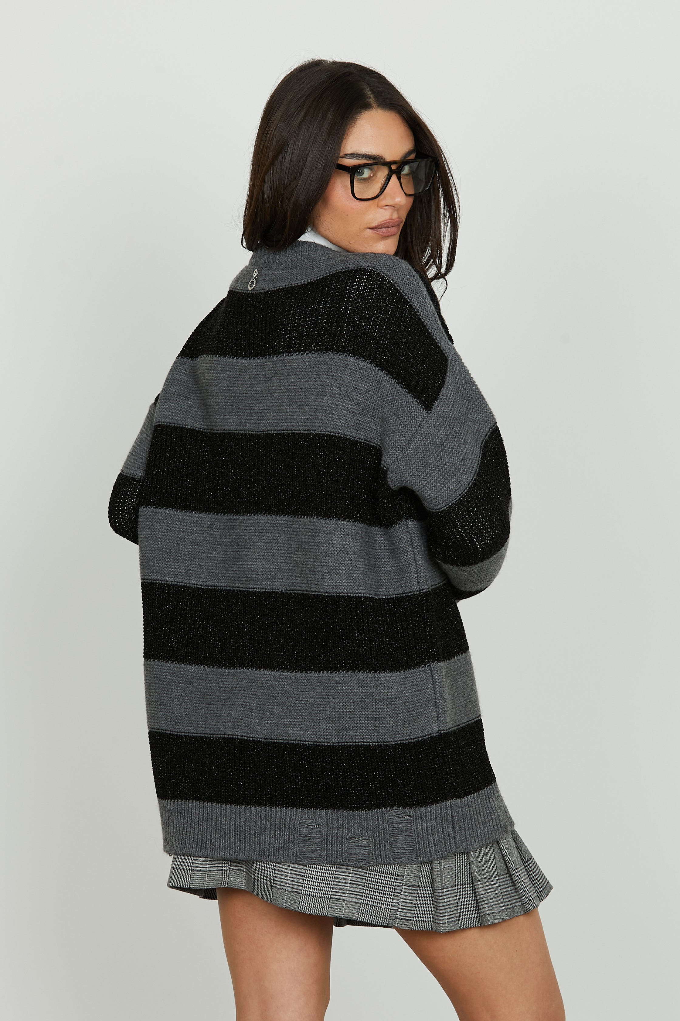 Lunga, morbida e dallo scollo a V profondo, la maglia Artemis gioca con righe luminose in lurex e rotture strategiche per un effetto lived-in ultra cool. Perfetta per look metropolitani che mixano grinta e femminilità con stile disinvolto.