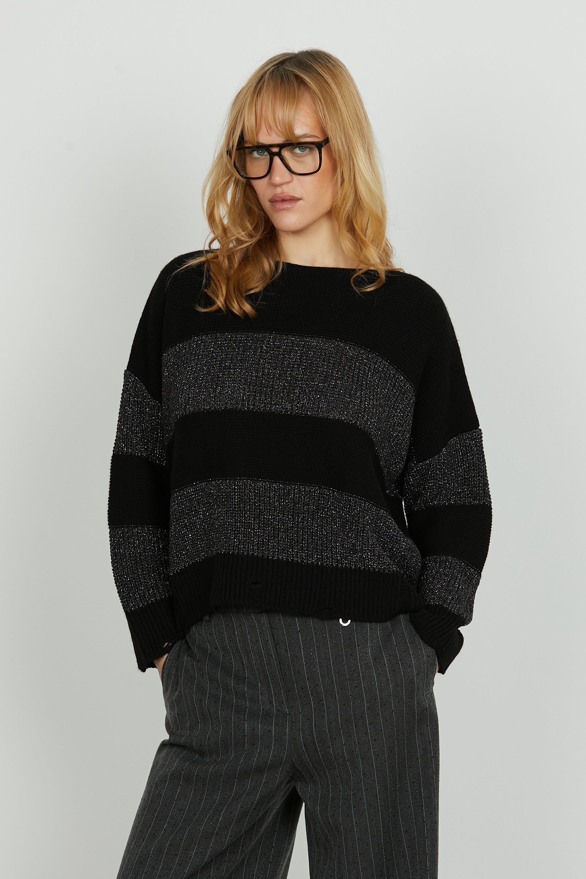 La maglia Calin combina volumi over e righe luminose in lurex con rotture strategiche, per un look dal carattere urban e disinvolto. Perfetta per chi ama mixare comfort, tendenza e un tocco di brillante irriverenza.