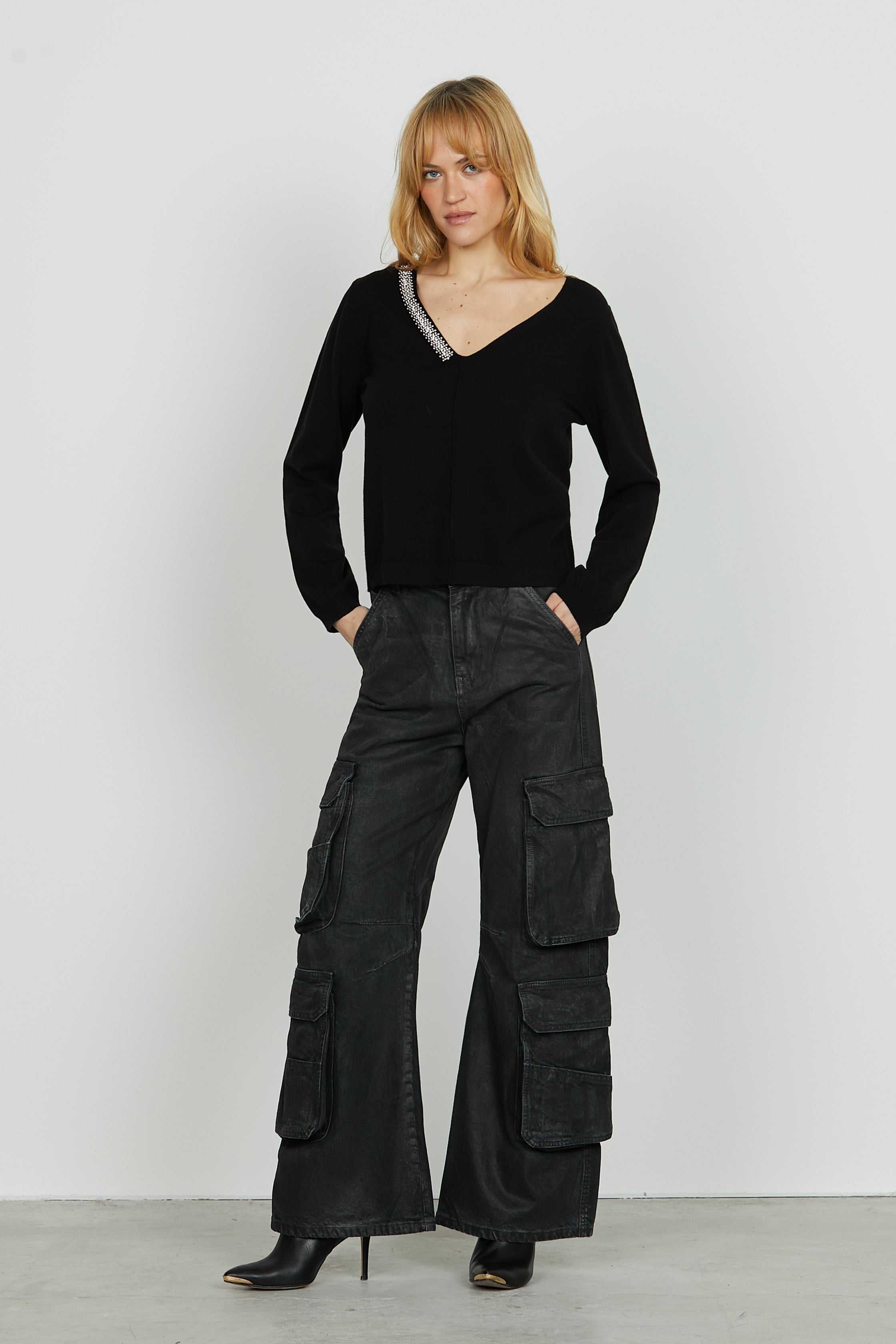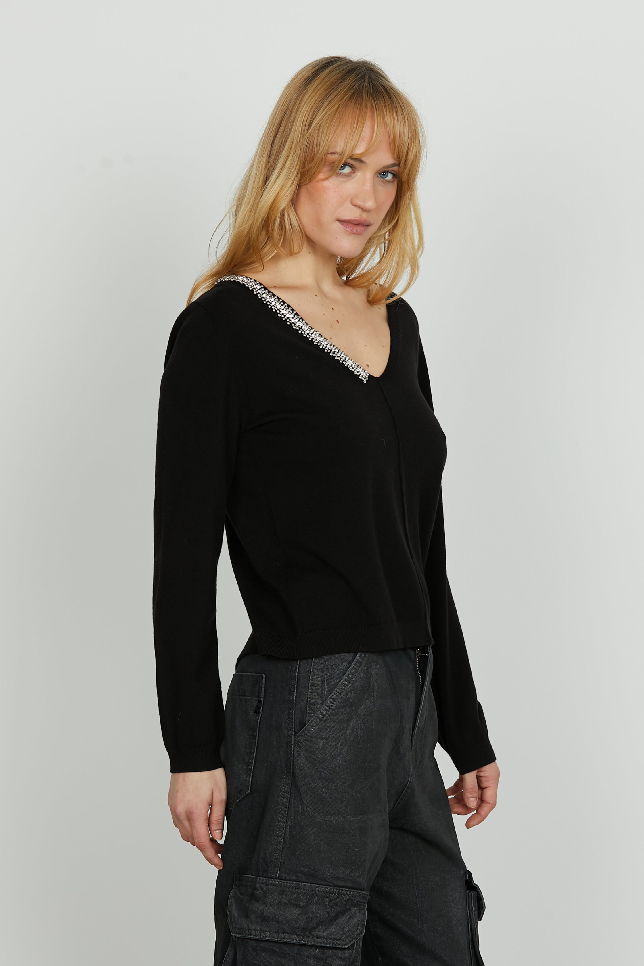 Maglia LEVITA manica lunga scollo v con applicazione perline più strass