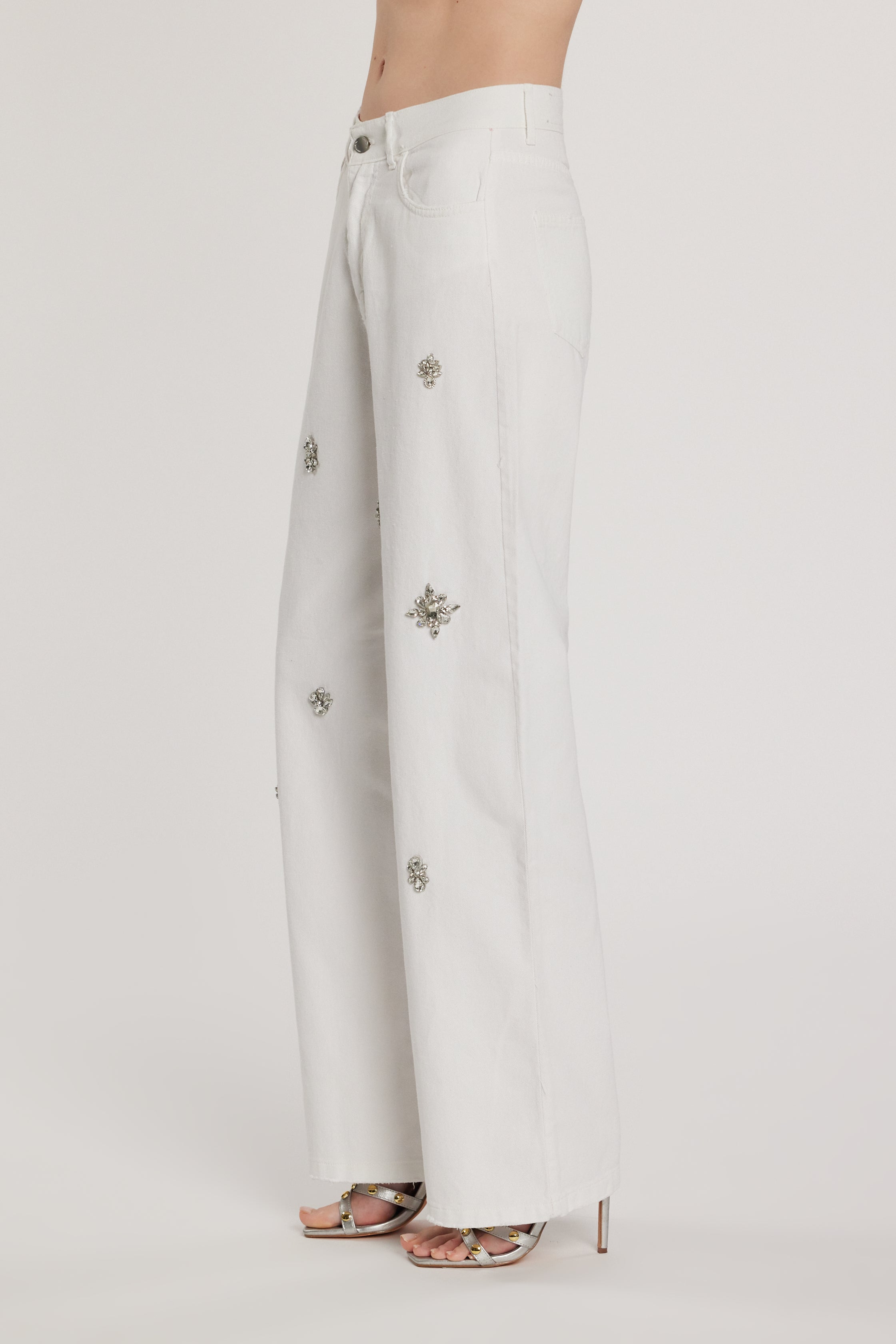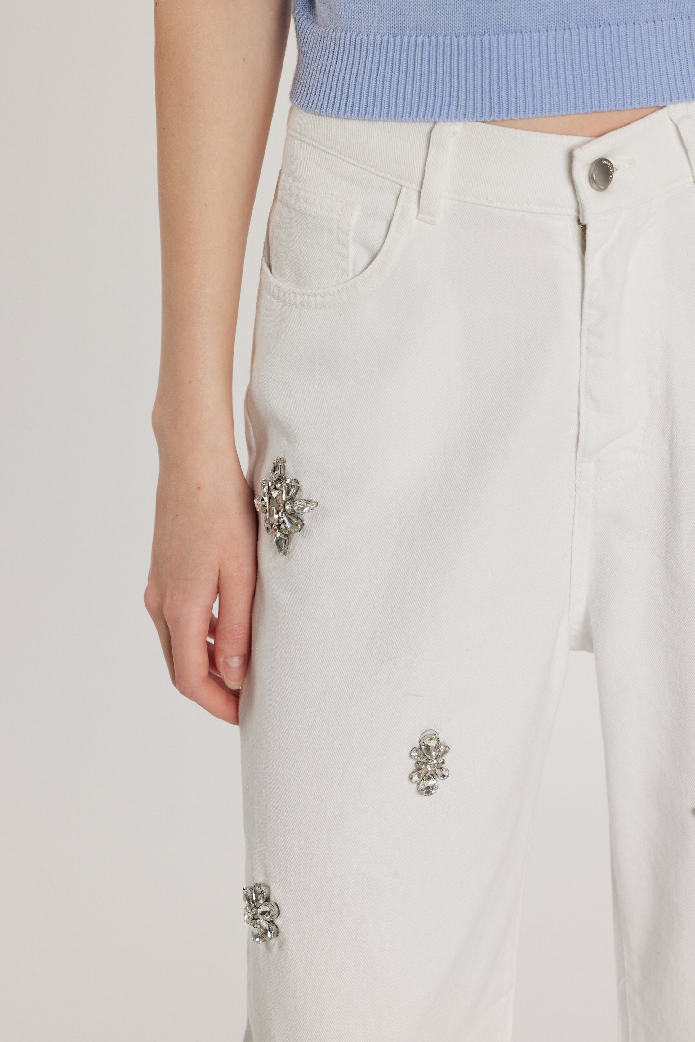Pantalone Giselle_15 vita media cinque tasche con applicazioni pietre, loose fit in bull denim, un capo confortevole e fashion. Il fit morbido garantisce libertà di movimento, mentre le pietre decorative aggiungono carattere e luce, perfetto per look casual chic.