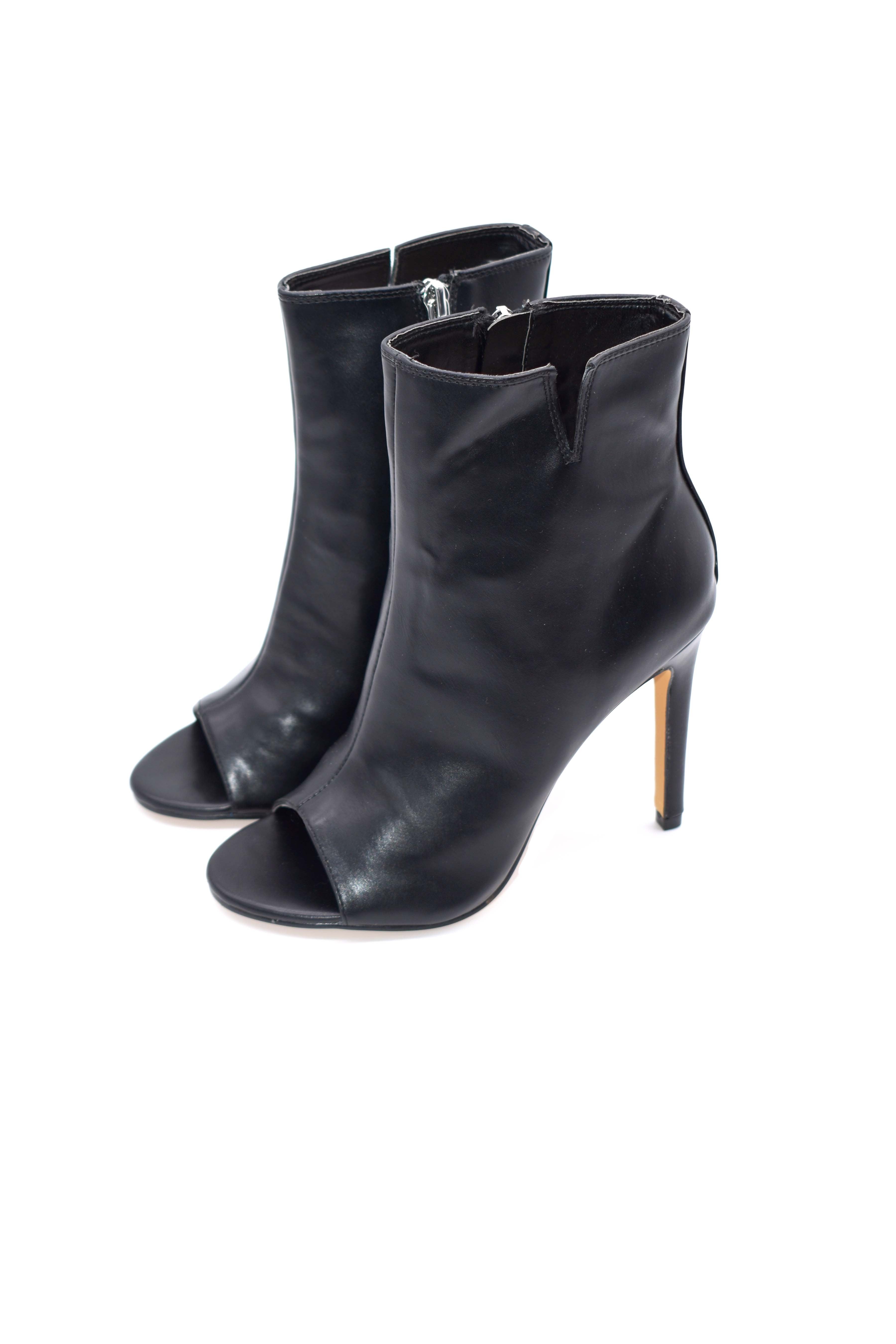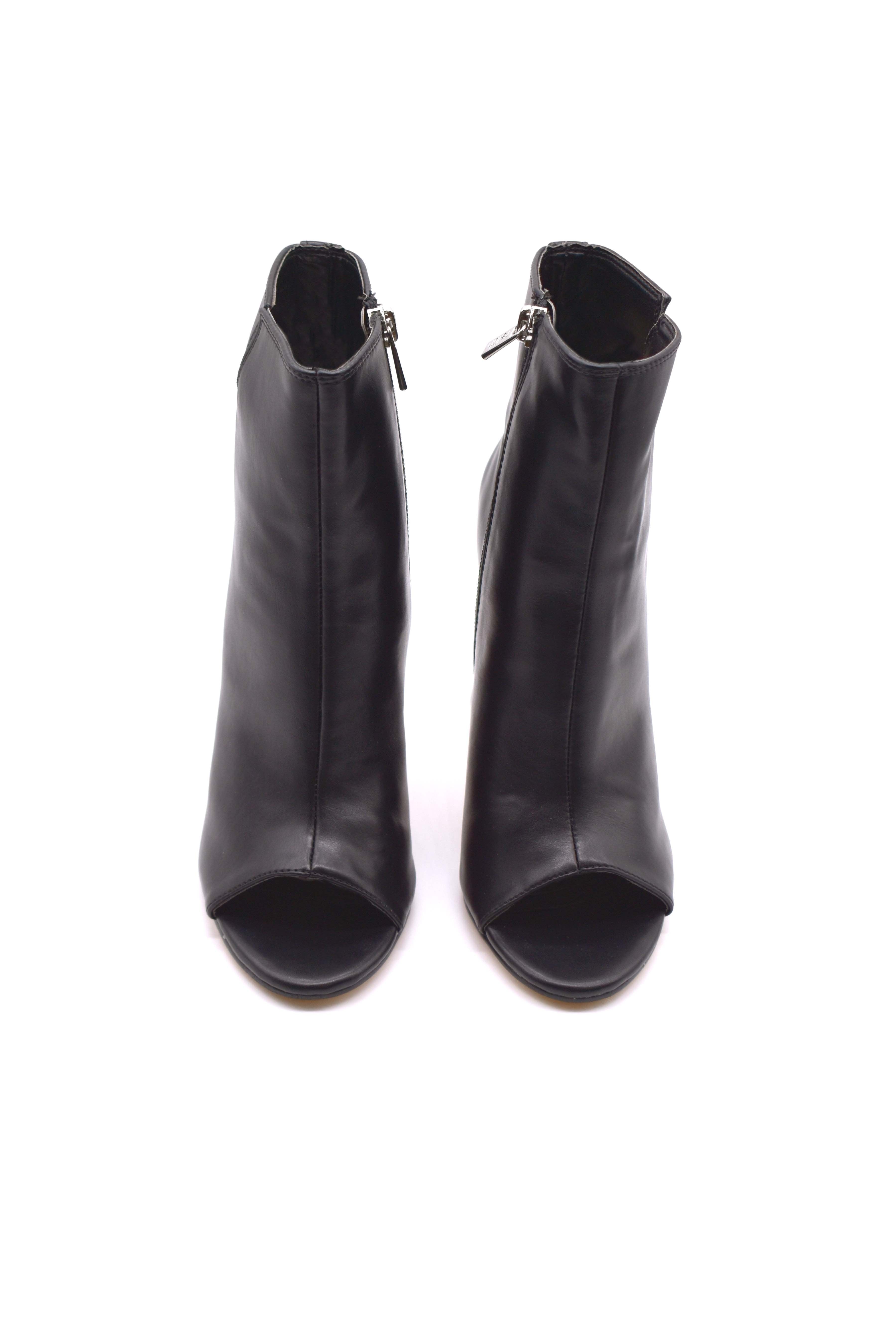 Potenziate la vostra collezione di calzature d'autore con gli stivaletti neri in ecopelle ELODIE. Il design peep-toe slanciato da un sottile tacco a rocchetto strizza l'occhio allo stile boudoir. Obbligatorio metterli in bella mostra sotto gonne midi o abiti bodycon.