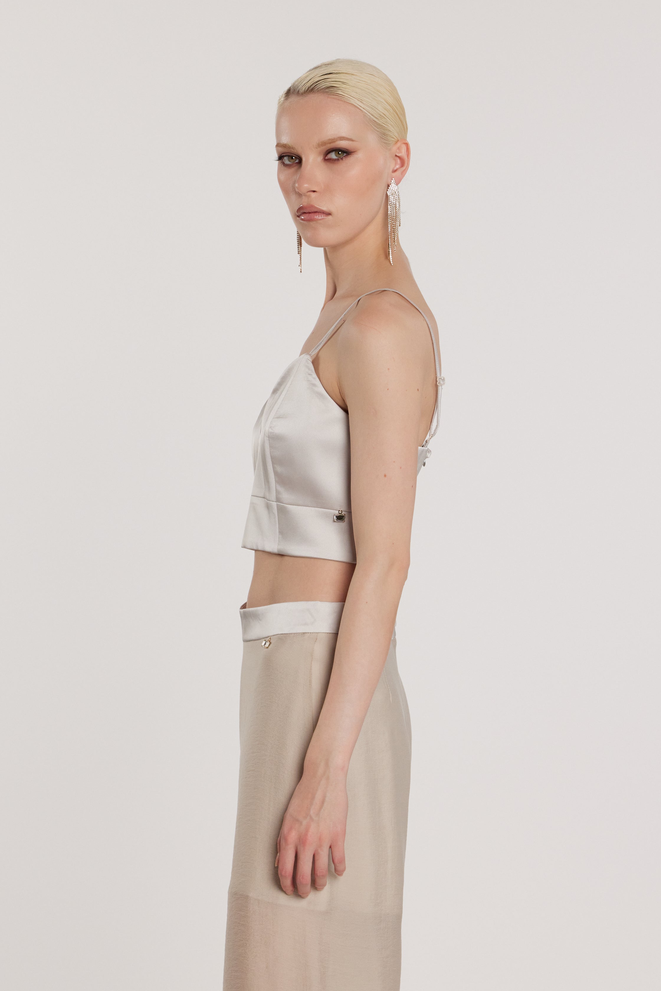 Eleganza minimal e sofisticata in un capo essenziale: questo crop-top in raso veste con lucentezza, donando un tocco chic a ogni look.