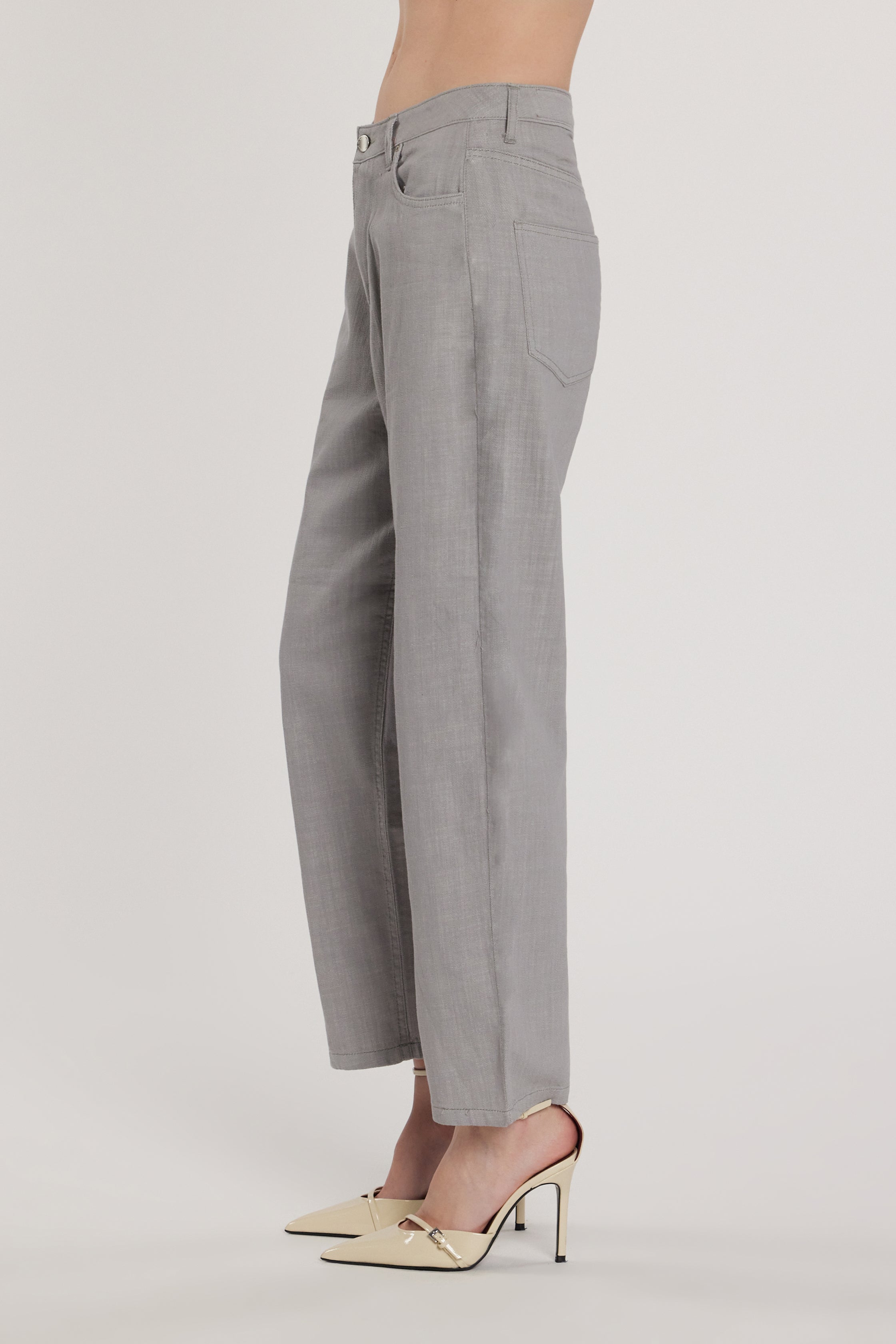 Pantalone Carla_32_Snz vita media cinque tasche, baggy fit in cotone grigio, un modello versatile e moderno. Il fit ampio dona comfort, mentre il design essenziale e le tasche decorative aggiungono un tocco urbano sofisticato, ideale per look day to night.
